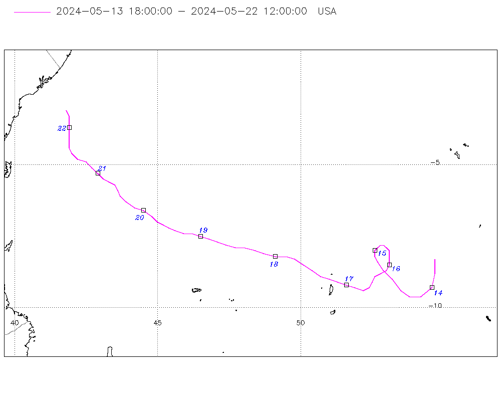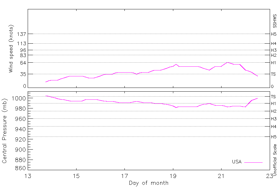 65 kt (May 21 06Z), 982 mb (May 19 03Z) |