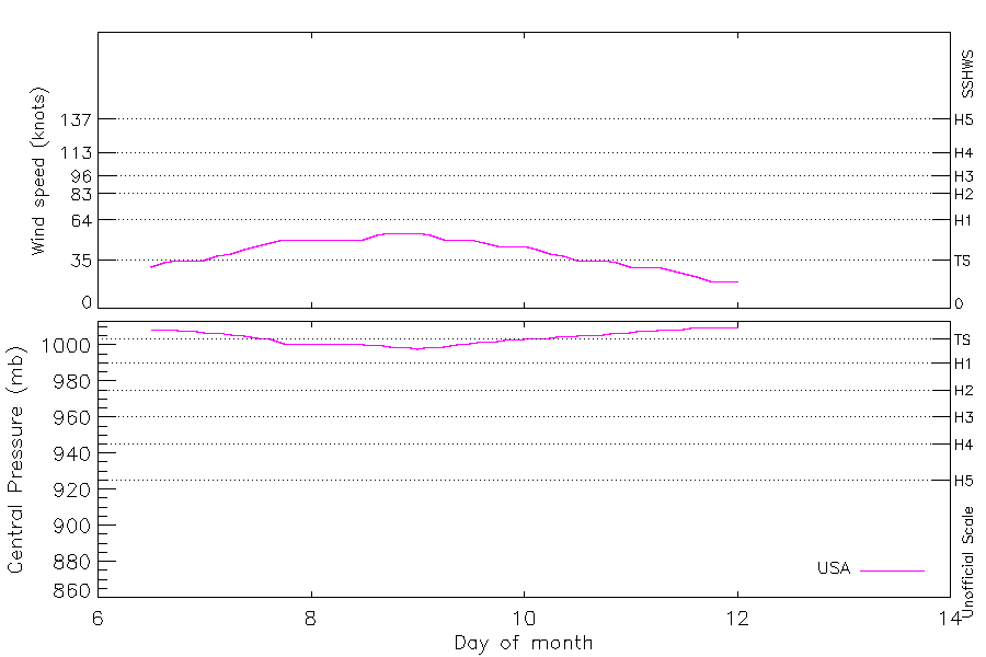 55 kt (Aug 8 18Z), 998 mb (Aug 9 00Z) |