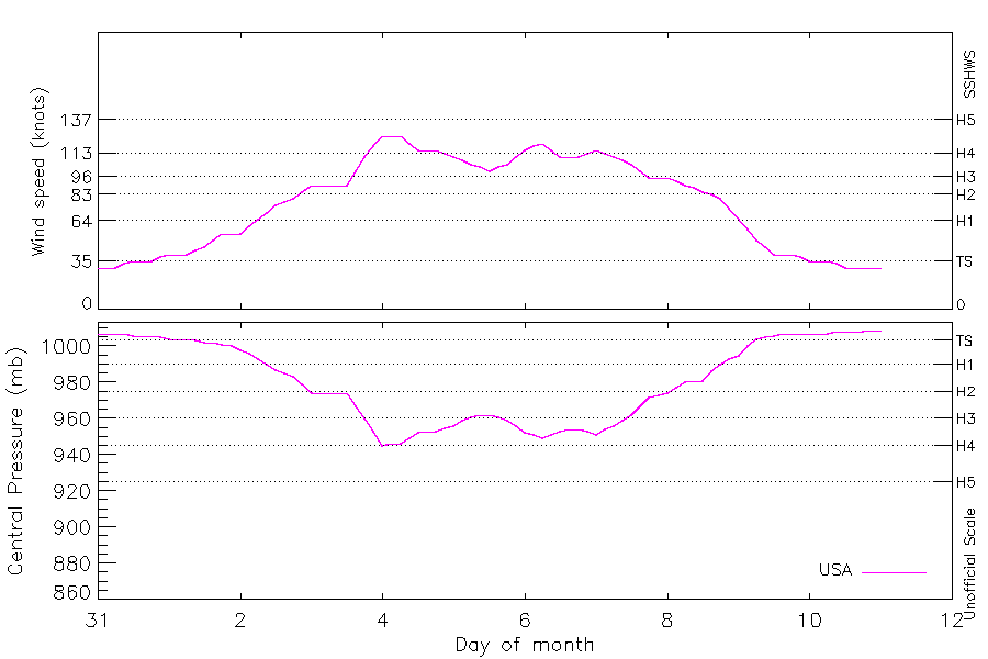 125 kt (Sep 4 00Z), 945 mb (Sep 4 00Z) |