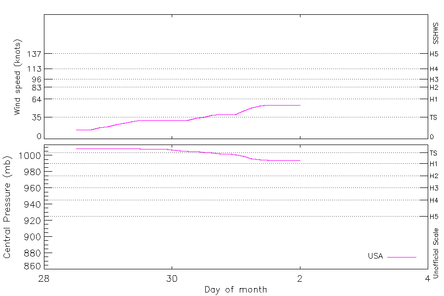 55 kt (Oct 1 12Z), 994 mb (Oct 1 12Z) |