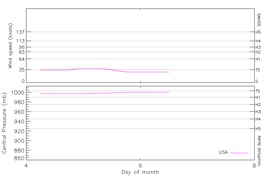 39 kt (Mar 5 00Z), 997 mb (Mar 4 12Z) |
