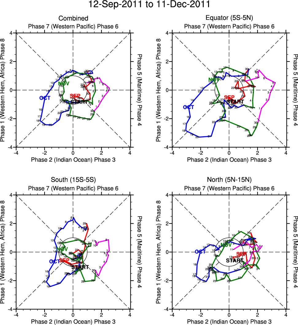 This page takes that simple index and breaks it down into its components, either by variable or by latitude. For latitudes, the data from each latitude band are simply projected onto the original RMM empirical orthogonal functions (EOFs), which were calculated using the full band 15S-15N. For the variables, the data are similarly projected on the original EOFs. In this case, the resulting PCs are re-standardized based on their 1980-2010 time series. This step is necessary for comparison because the OLR PCs have significantly lower amplitudes.