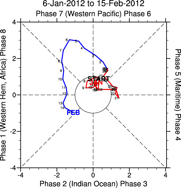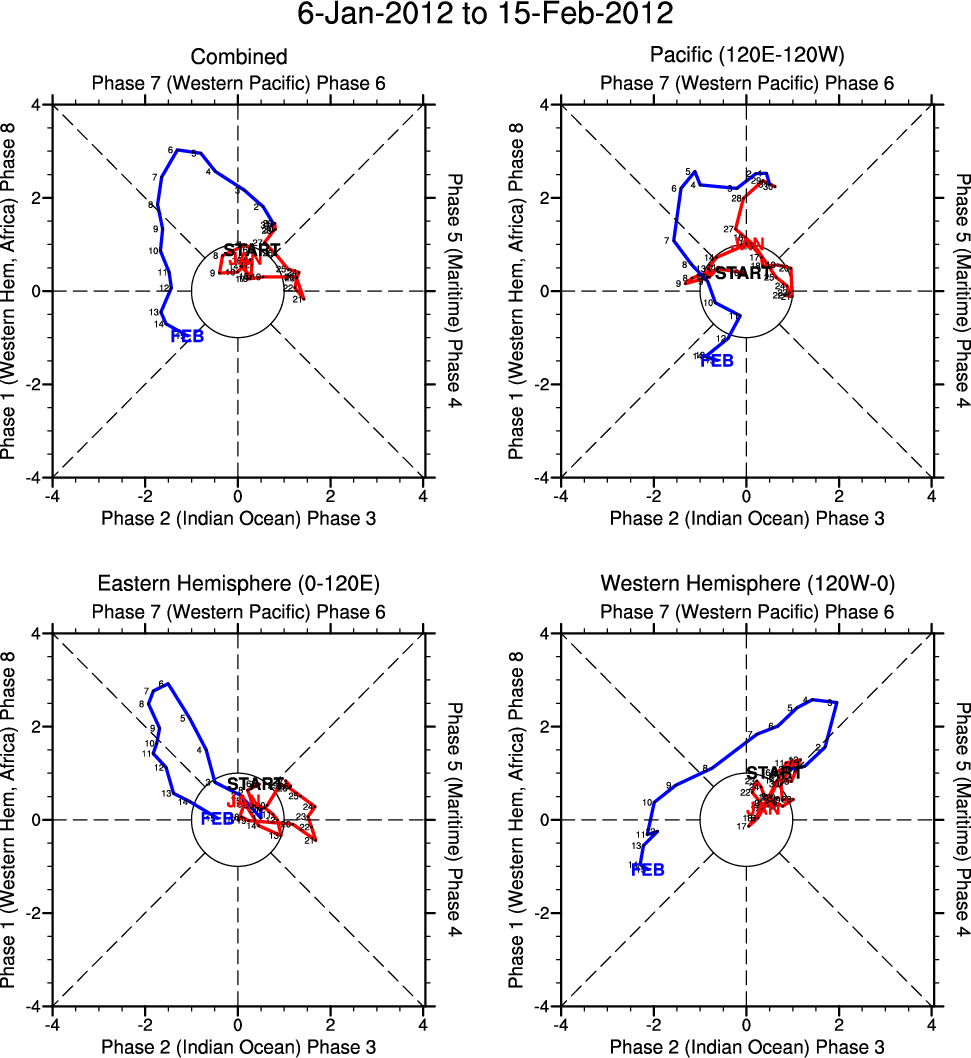 Wheeler and Hendon (2004) constructed the RMM index for monitoring the MJO. This index consists of the first two principal components (PCs) of OLR, 850-hPa zonal wind, and 200-hPa zonal wind averaged 15S-15N.