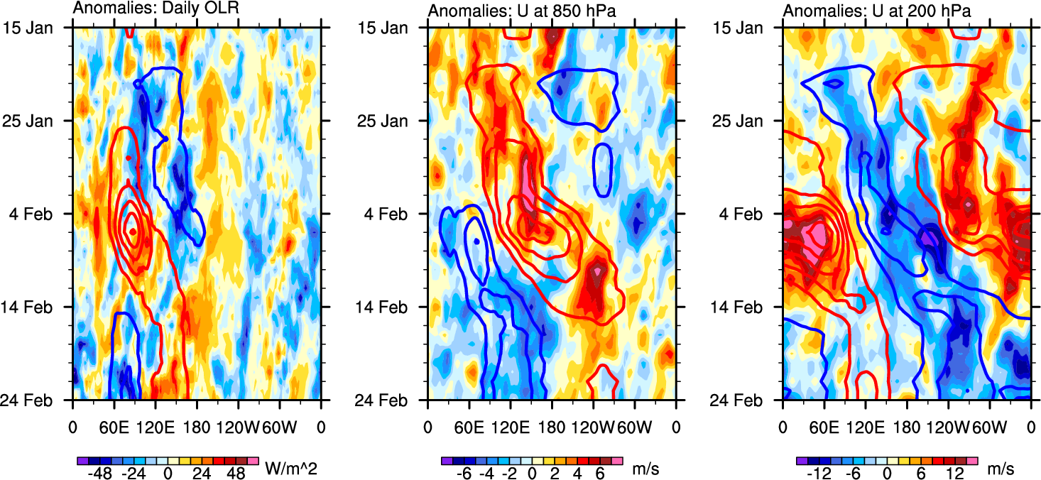 The Hovmollers show longitude-time plots for OLR, U-850, and U-200. The shading indicates the observed anomalies, while the contours are the projection of those anomalies onto the RMM EOFs.