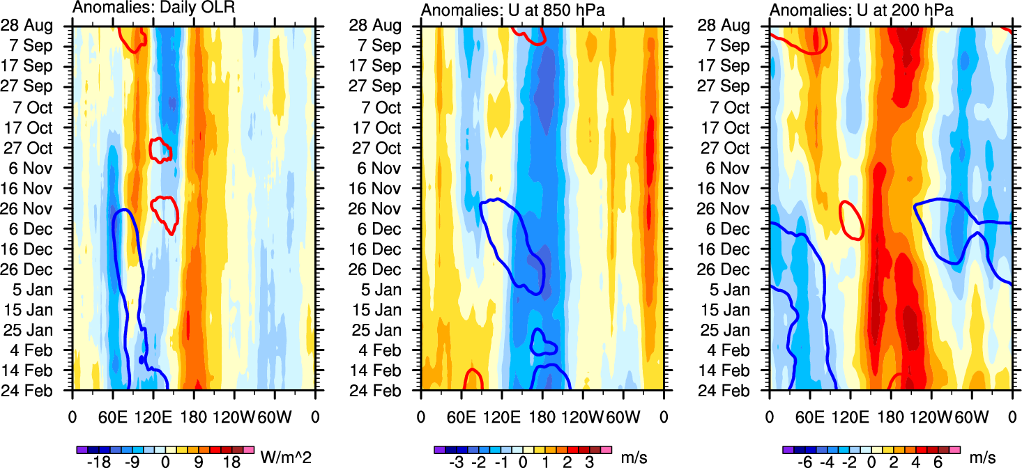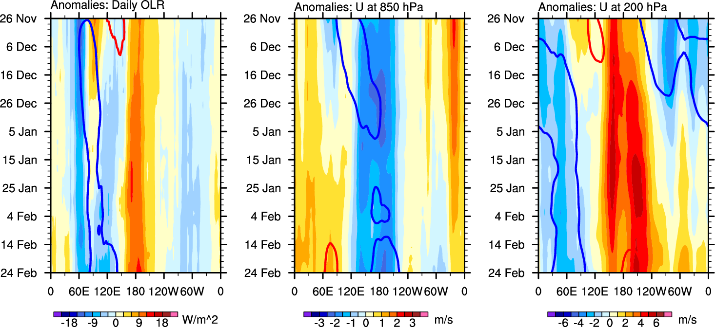The Hovmollers show longitude-time plots for OLR, U-850, and U-200. The shading indicates the observed anomalies, while the contours are the projection of those anomalies onto the RMM EOFs.