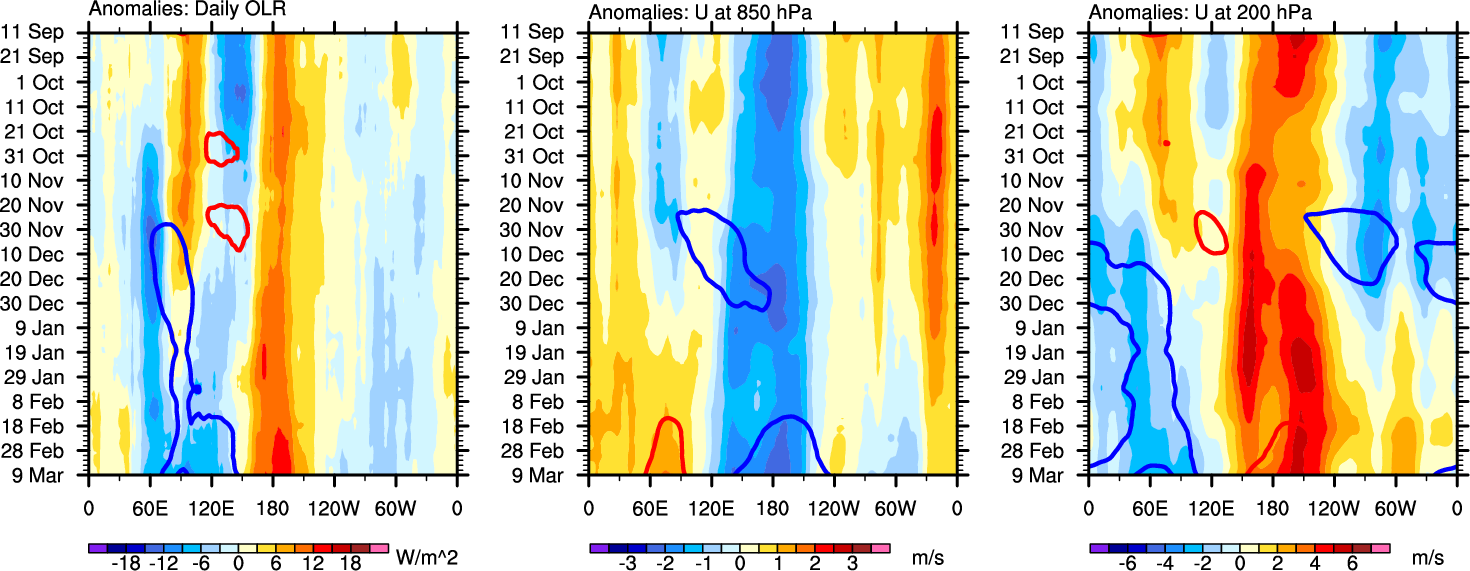 The Hovmollers show longitude-time plots for OLR, U-850, and U-200. The shading indicates the observed anomalies, while the contours are the projection of those anomalies onto the RMM EOFs.