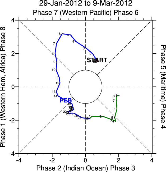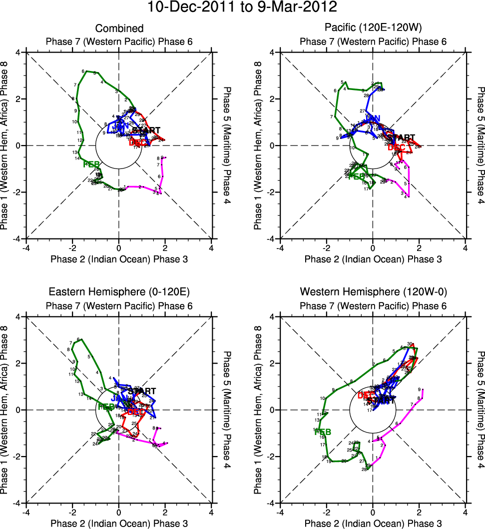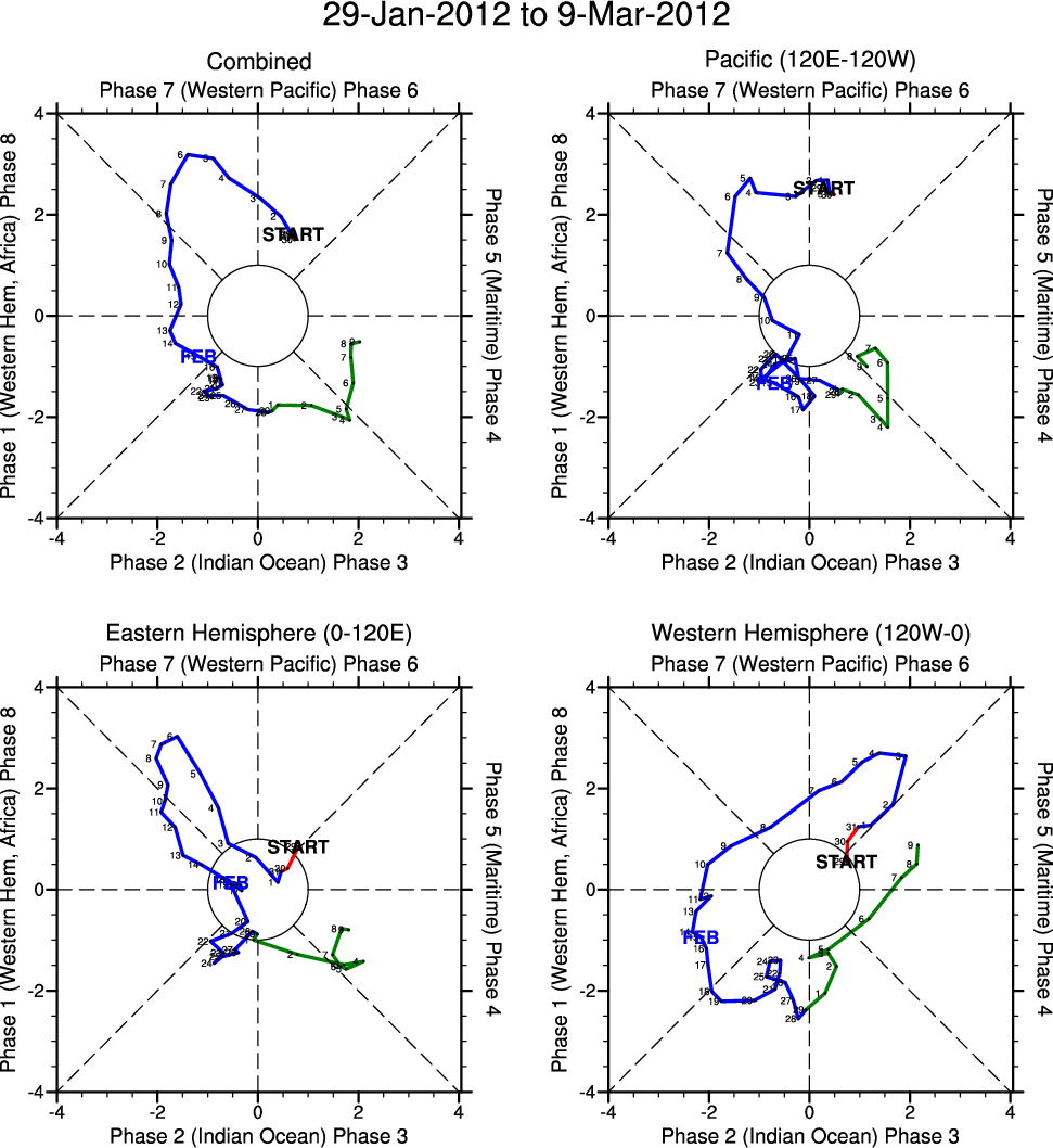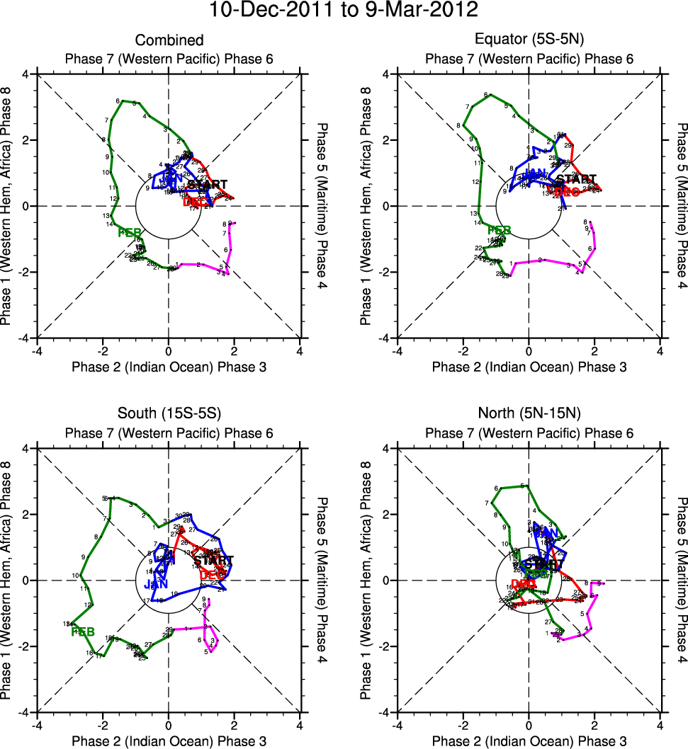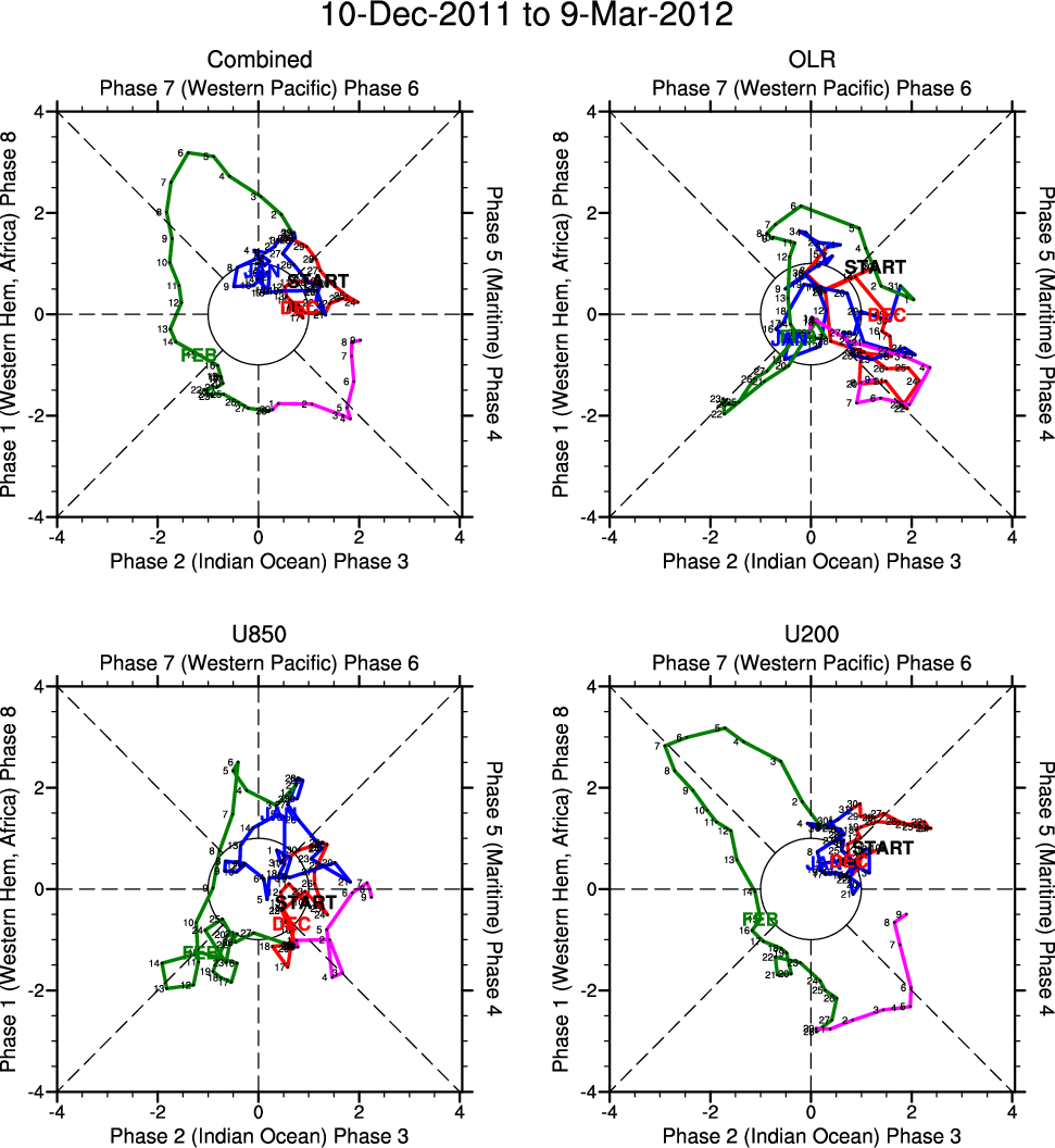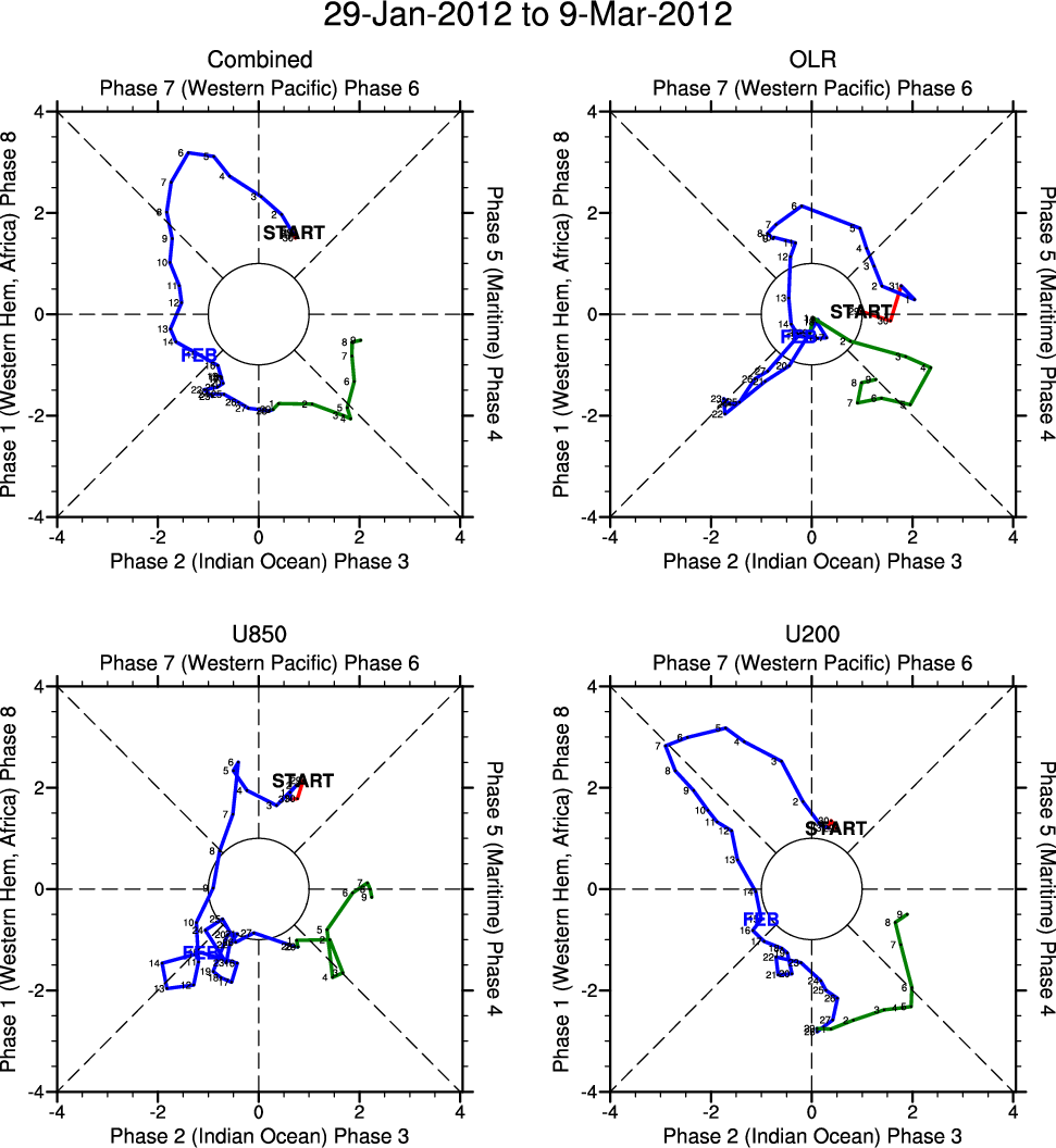 Wheeler and Hendon (2004) constructed the RMM index for monitoring the MJO. This index consists of the first two principal components (PCs) of OLR, 850-hPa zonal wind, and 200-hPa zonal wind averaged 15S-15N.