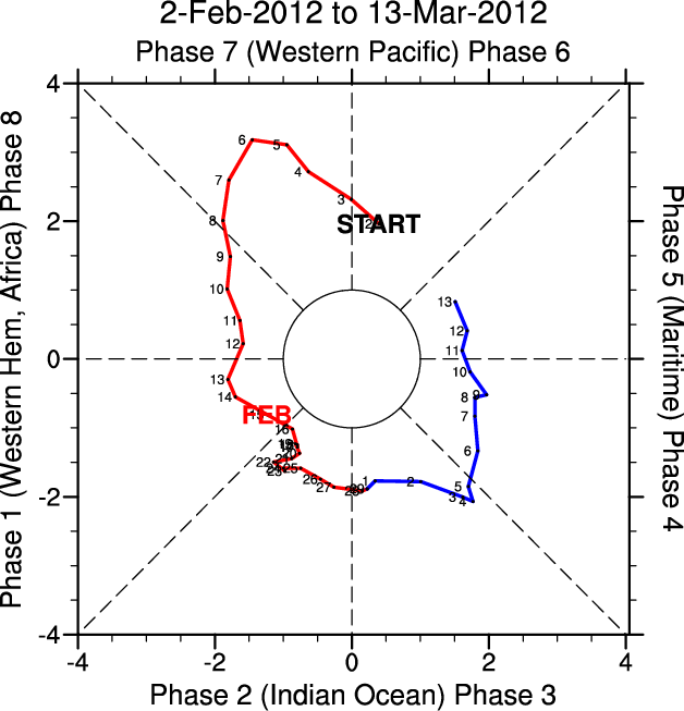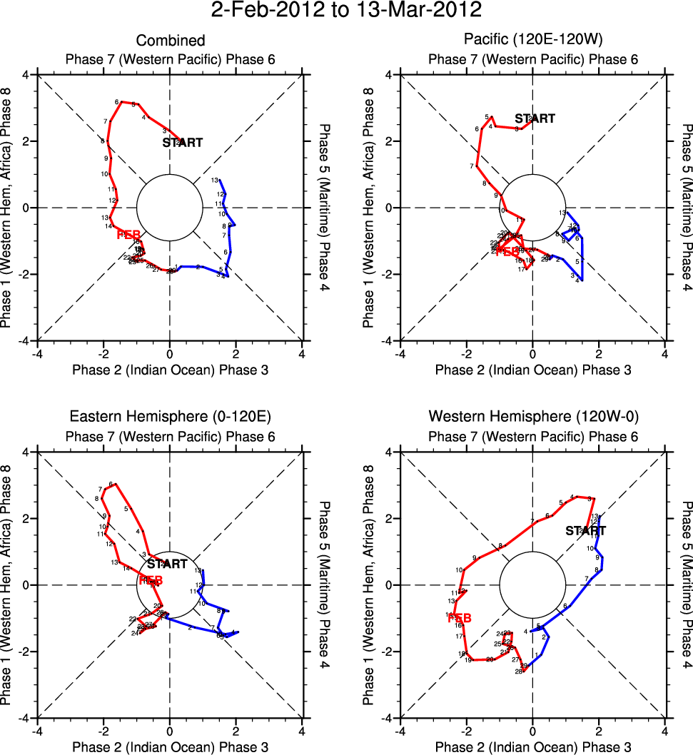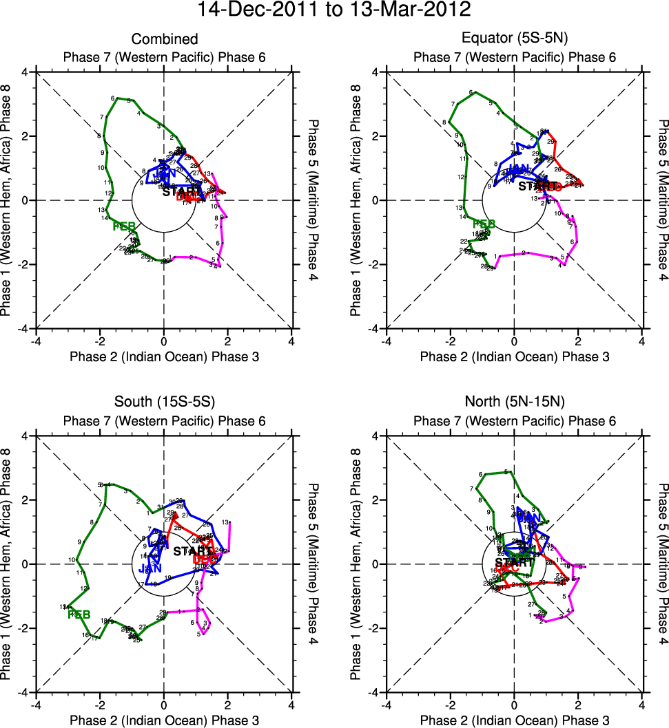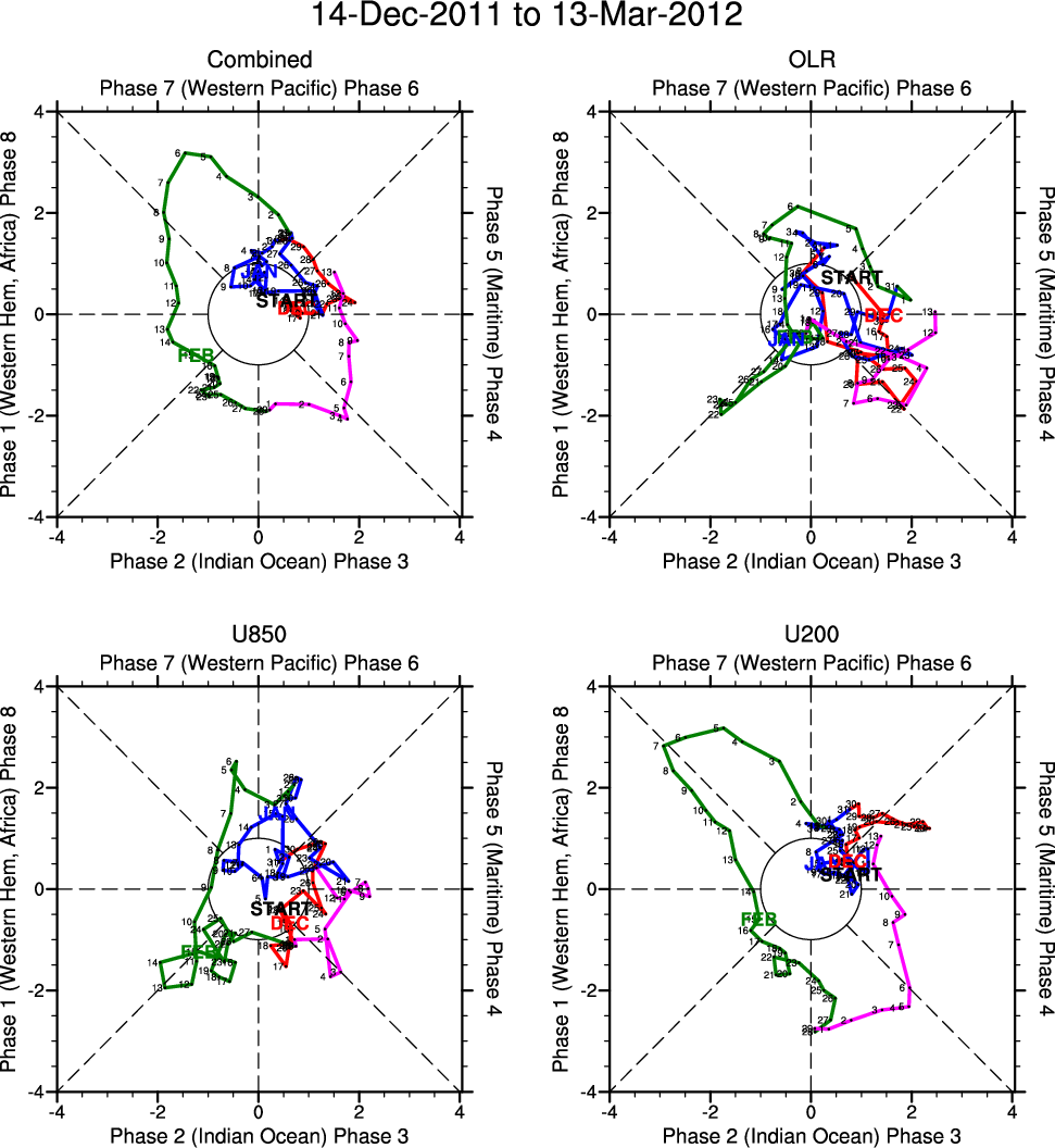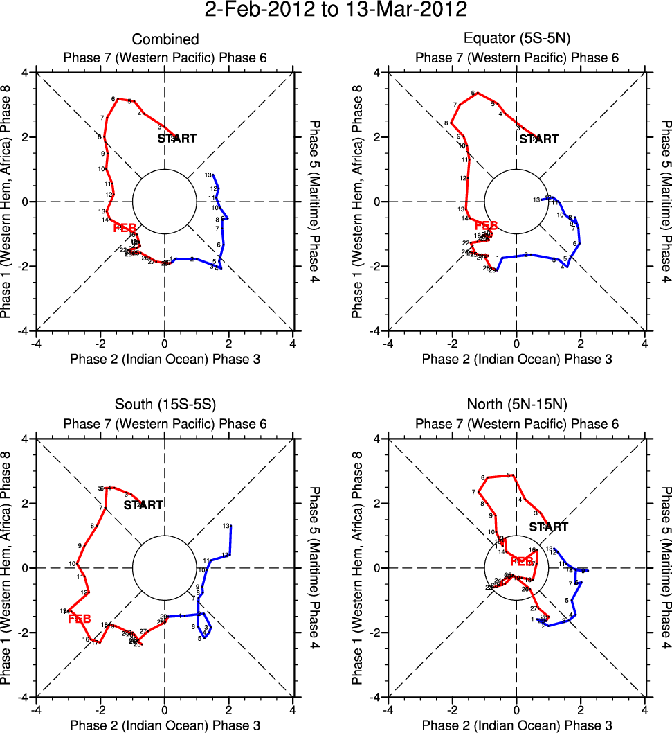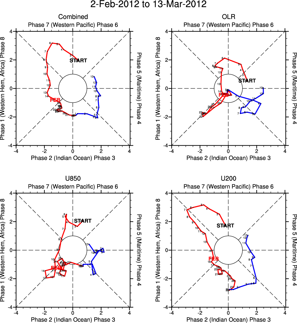 Wheeler and Hendon (2004) constructed the RMM index for monitoring the MJO. This index consists of the first two principal components (PCs) of OLR, 850-hPa zonal wind, and 200-hPa zonal wind averaged 15S-15N.