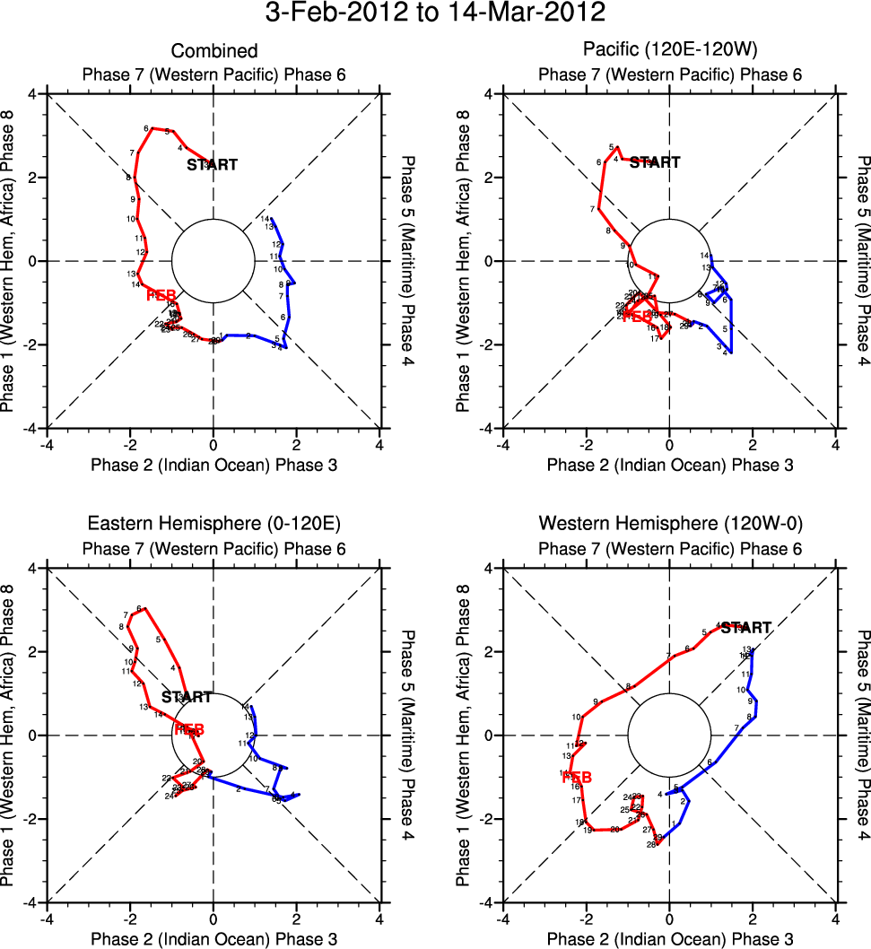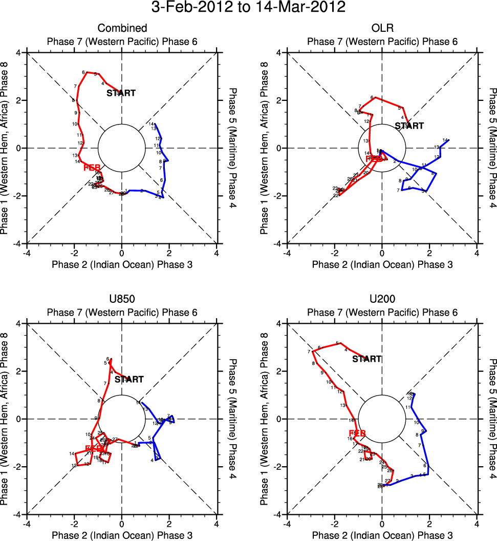 Wheeler and Hendon (2004) constructed the RMM index for monitoring the MJO. This index consists of the first two principal components (PCs) of OLR, 850-hPa zonal wind, and 200-hPa zonal wind averaged 15S-15N.