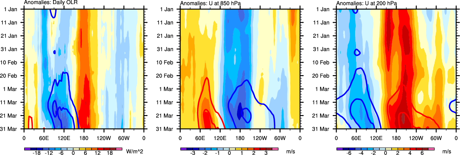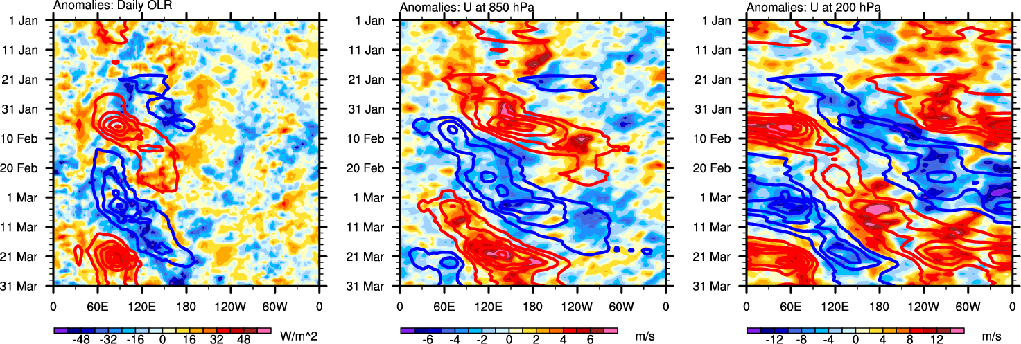 The Hovmollers show longitude-time plots for OLR, U-850, and U-200. The shading indicates the observed anomalies, while the contours are the projection of those anomalies onto the RMM EOFs.