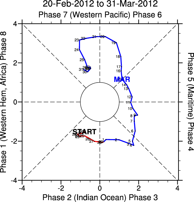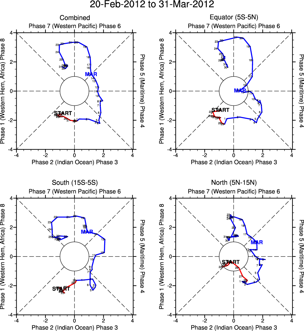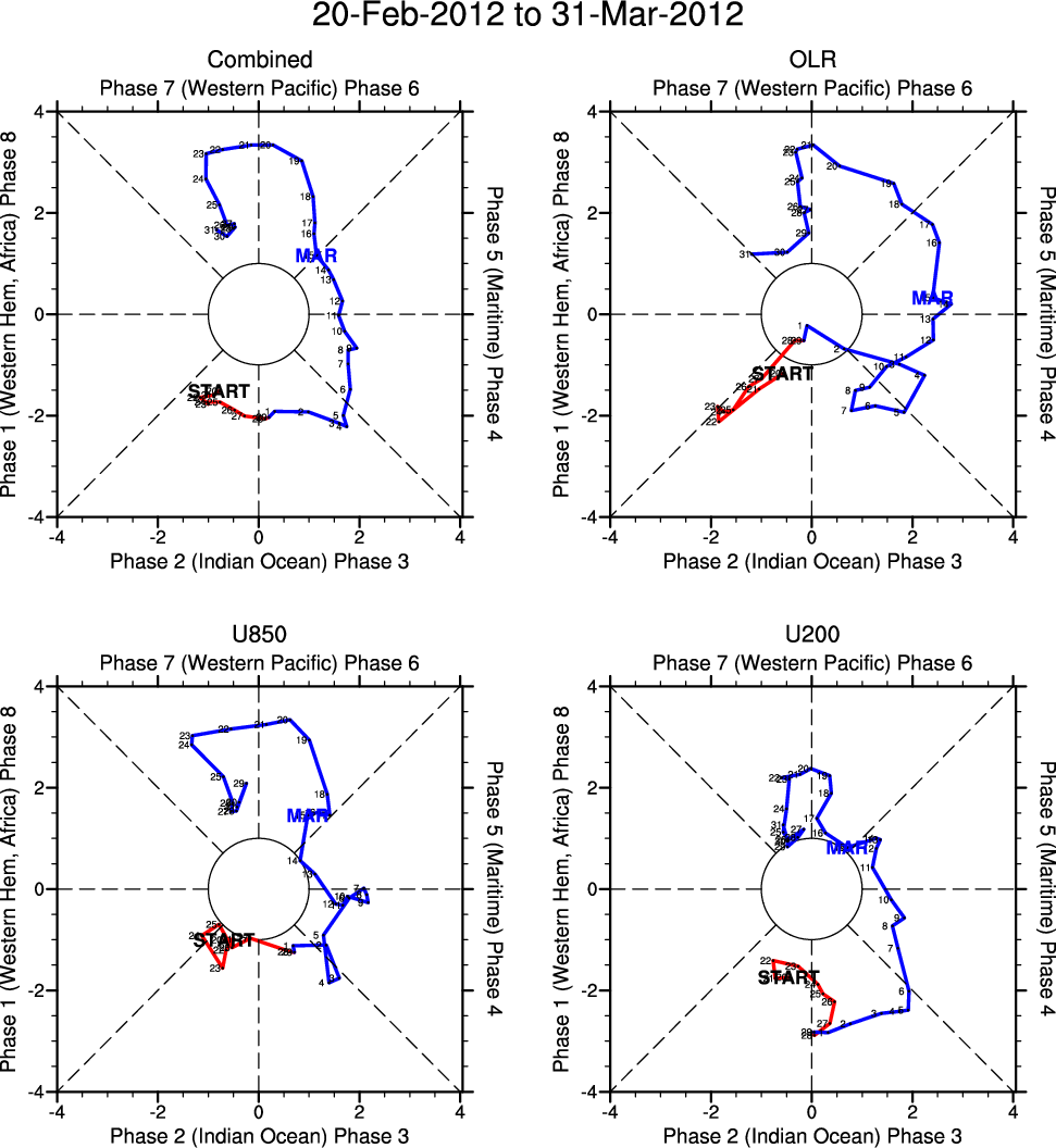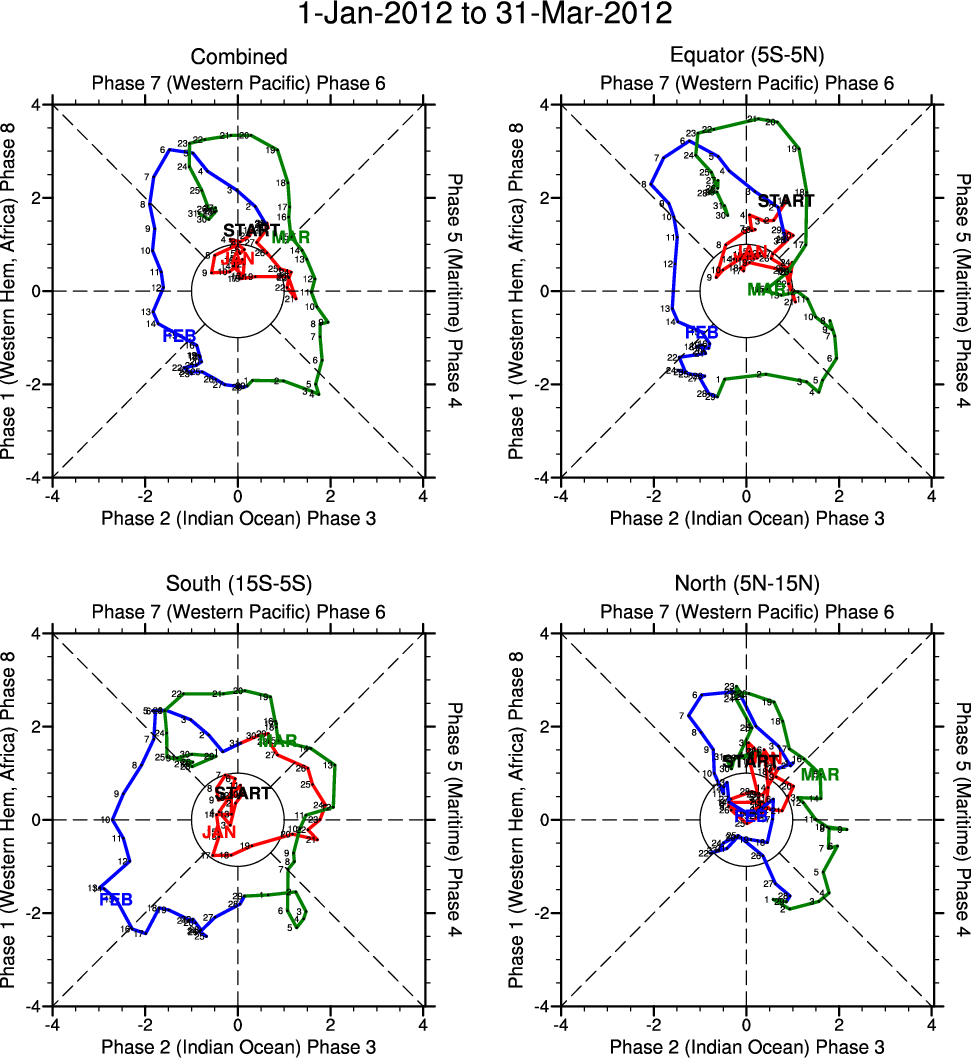 Wheeler and Hendon (2004) constructed the RMM index for monitoring the MJO. This index consists of the first two principal components (PCs) of OLR, 850-hPa zonal wind, and 200-hPa zonal wind averaged 15S-15N.
