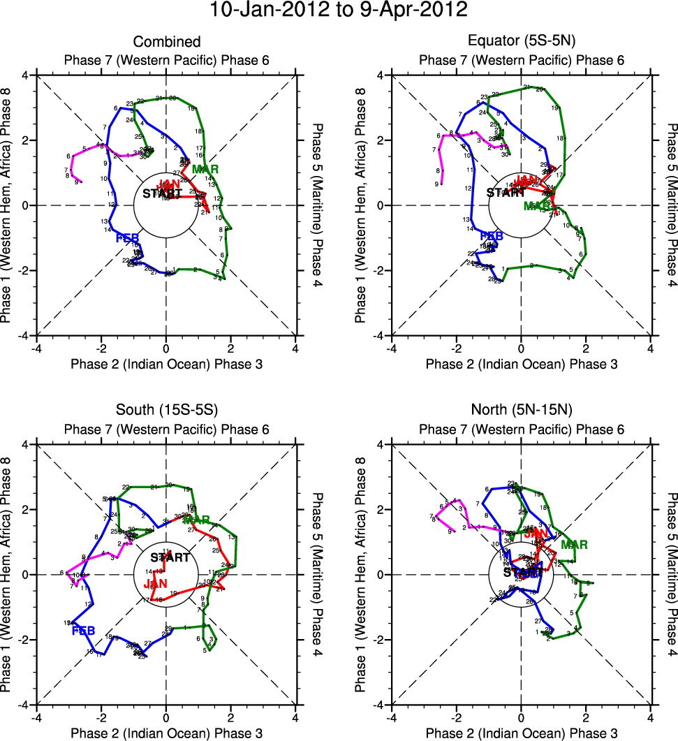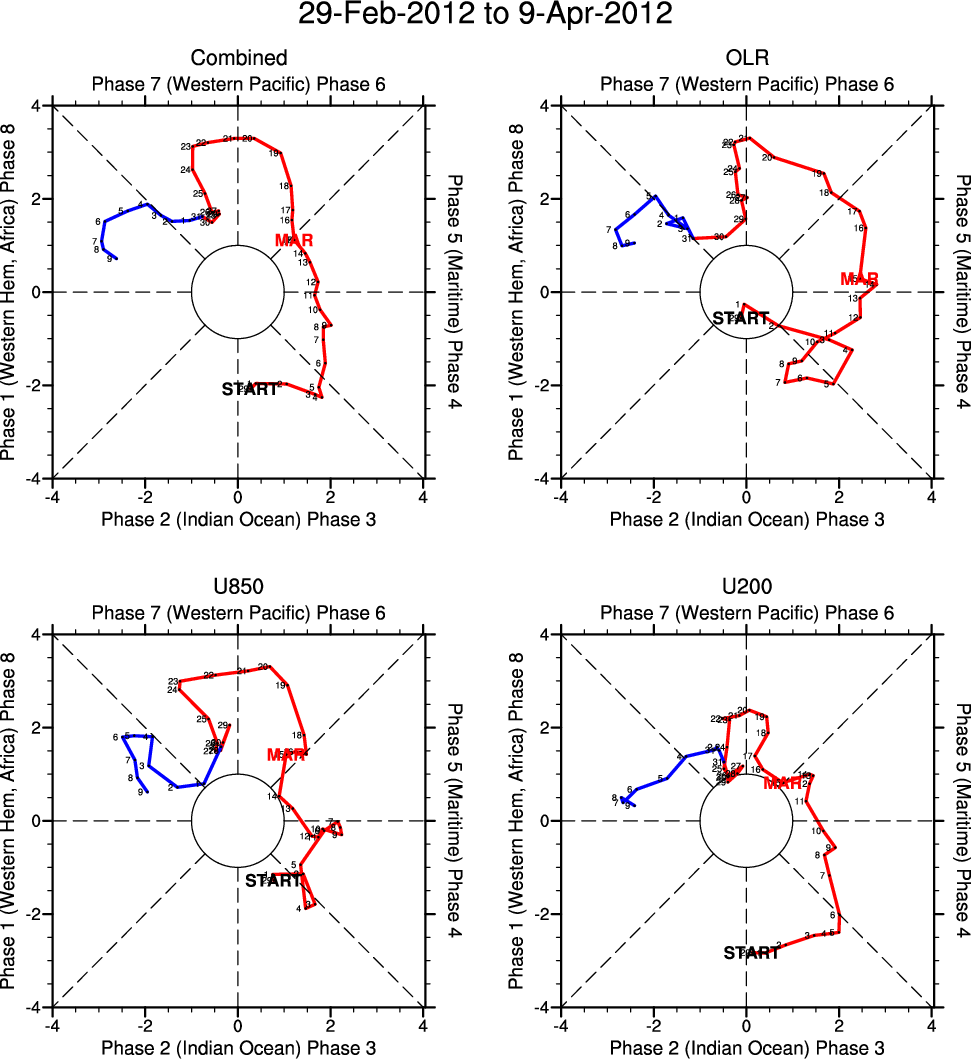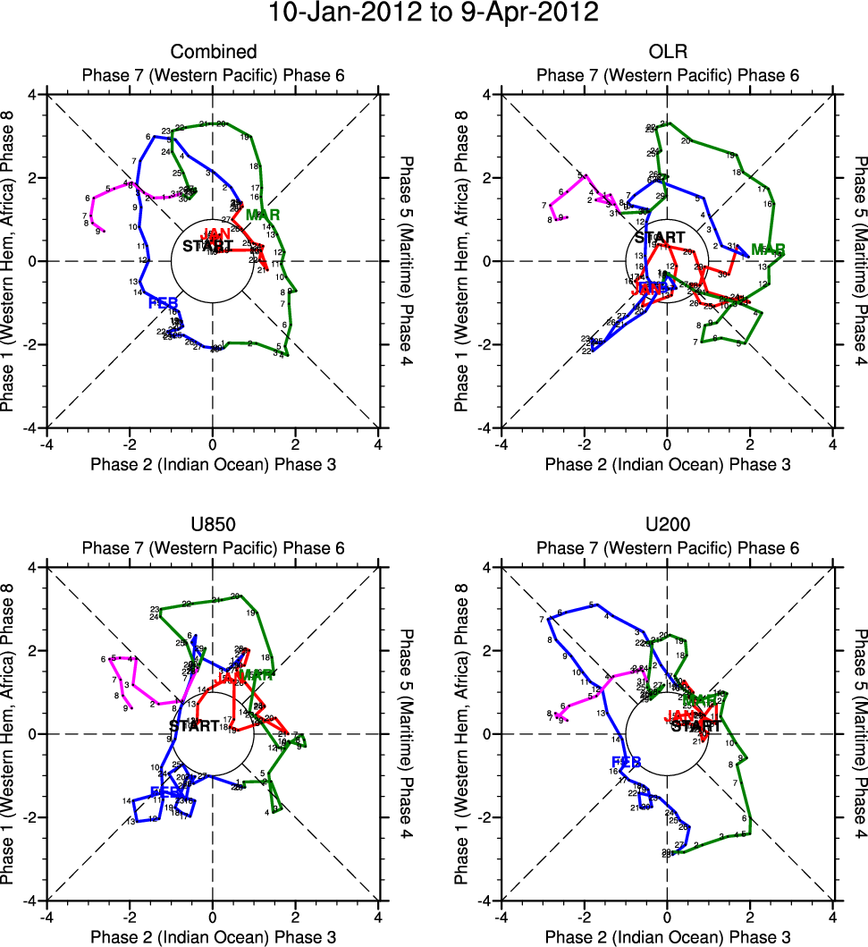 Wheeler and Hendon (2004) constructed the RMM index for monitoring the MJO. This index consists of the first two principal components (PCs) of OLR, 850-hPa zonal wind, and 200-hPa zonal wind averaged 15S-15N.