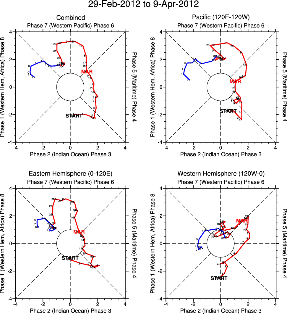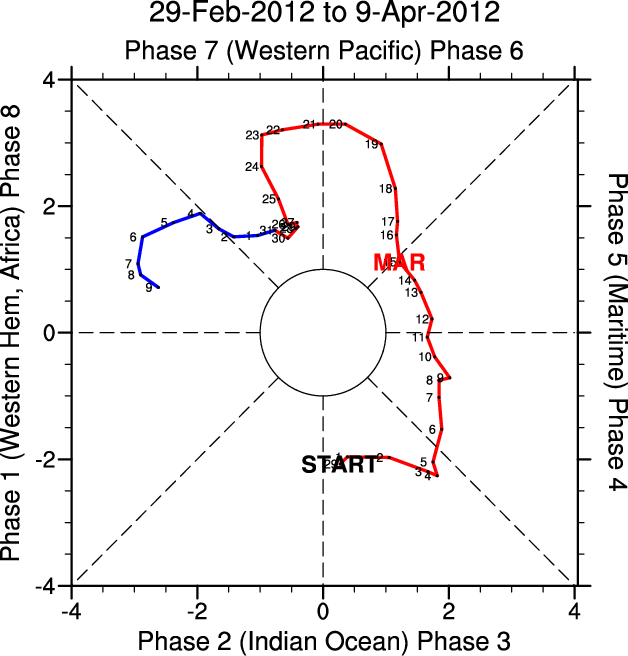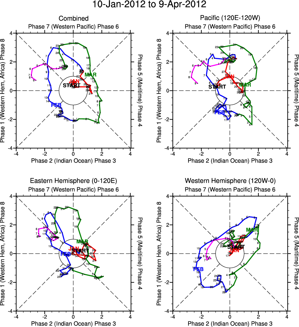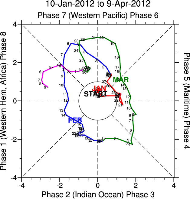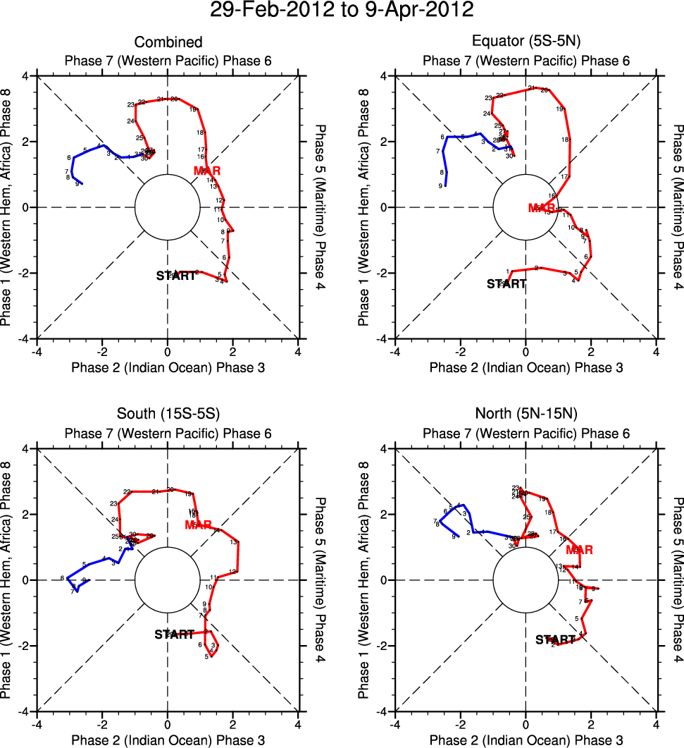 Wheeler and Hendon (2004) constructed the RMM index for monitoring the MJO. This index consists of the first two principal components (PCs) of OLR, 850-hPa zonal wind, and 200-hPa zonal wind averaged 15S-15N.