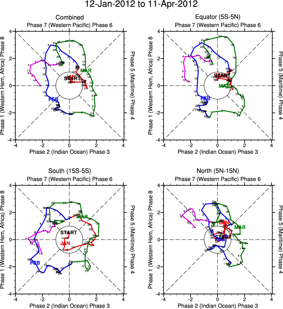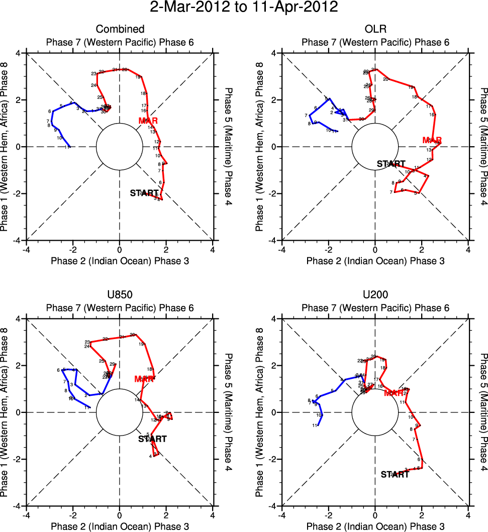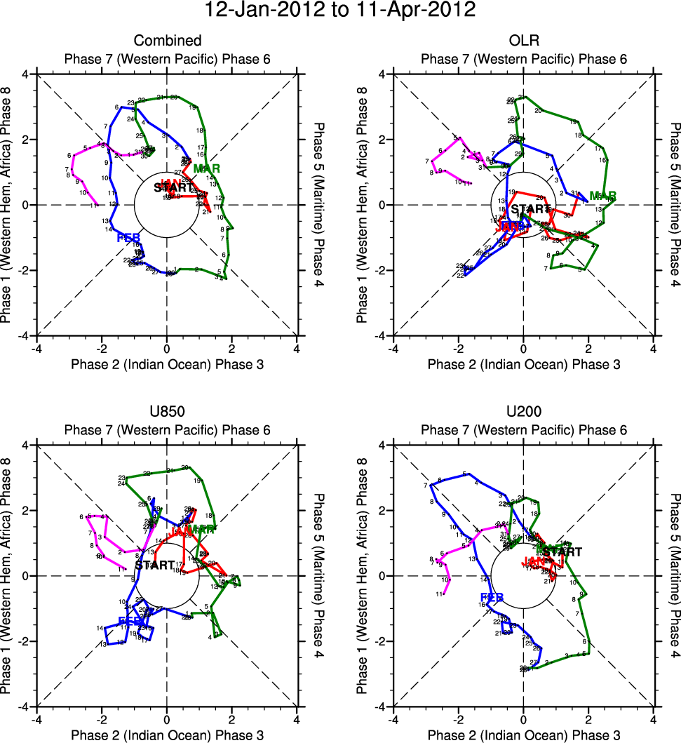 Wheeler and Hendon (2004) constructed the RMM index for monitoring the MJO. This index consists of the first two principal components (PCs) of OLR, 850-hPa zonal wind, and 200-hPa zonal wind averaged 15S-15N.