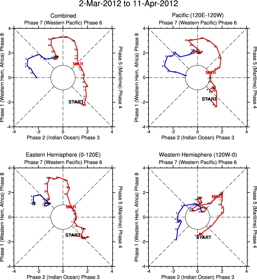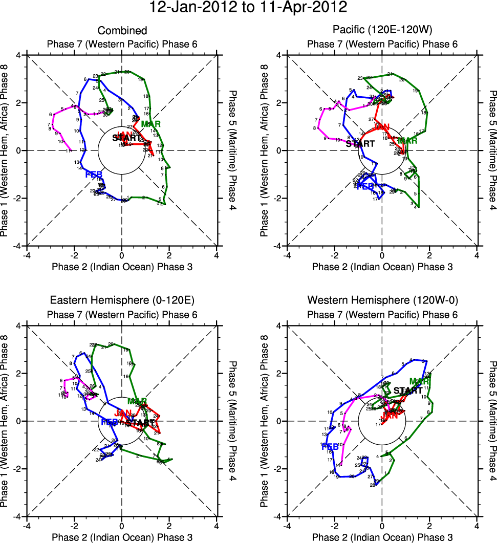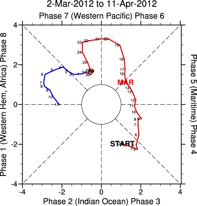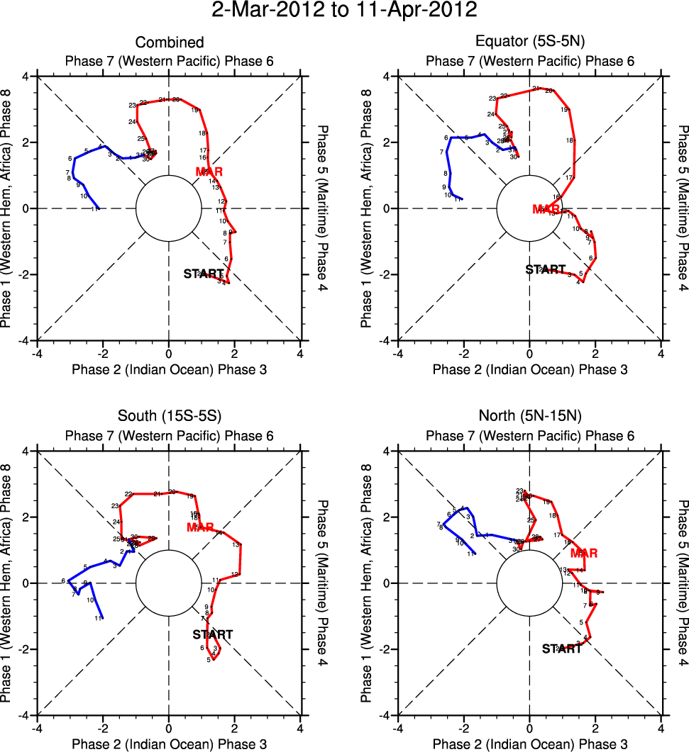 Wheeler and Hendon (2004) constructed the RMM index for monitoring the MJO. This index consists of the first two principal components (PCs) of OLR, 850-hPa zonal wind, and 200-hPa zonal wind averaged 15S-15N.