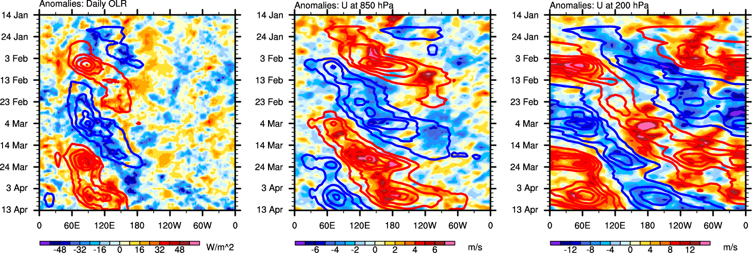 The Hovmollers show longitude-time plots for OLR, U-850, and U-200. The shading indicates the observed anomalies, while the contours are the projection of those anomalies onto the RMM EOFs.