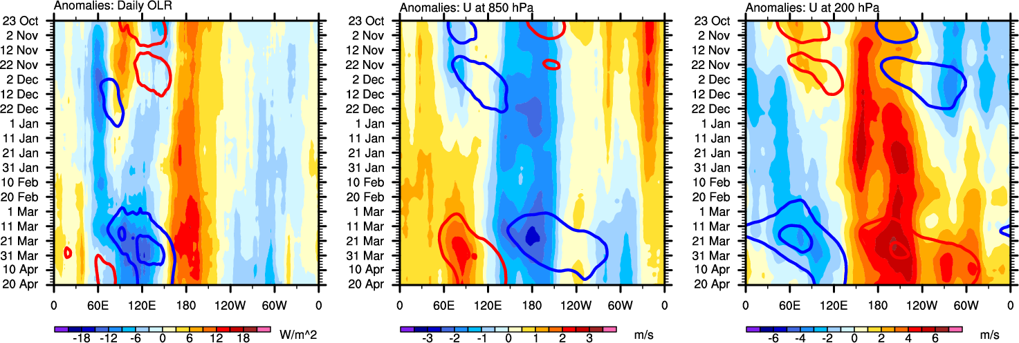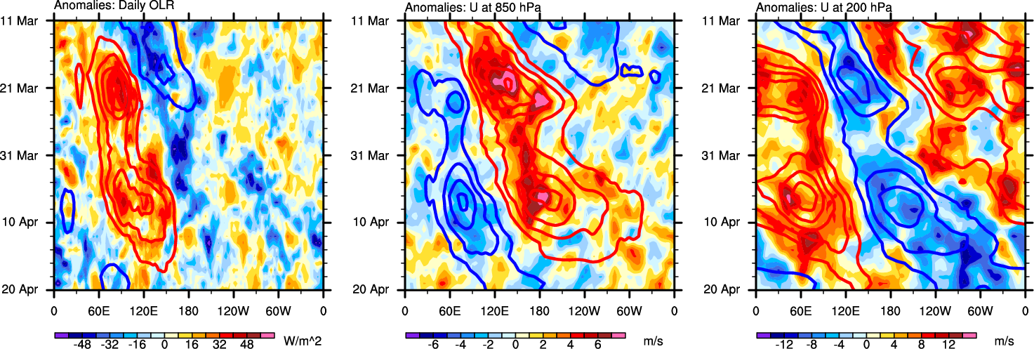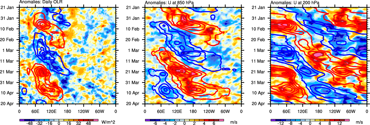 The Hovmollers show longitude-time plots for OLR, U-850, and U-200. The shading indicates the observed anomalies, while the contours are the projection of those anomalies onto the RMM EOFs.