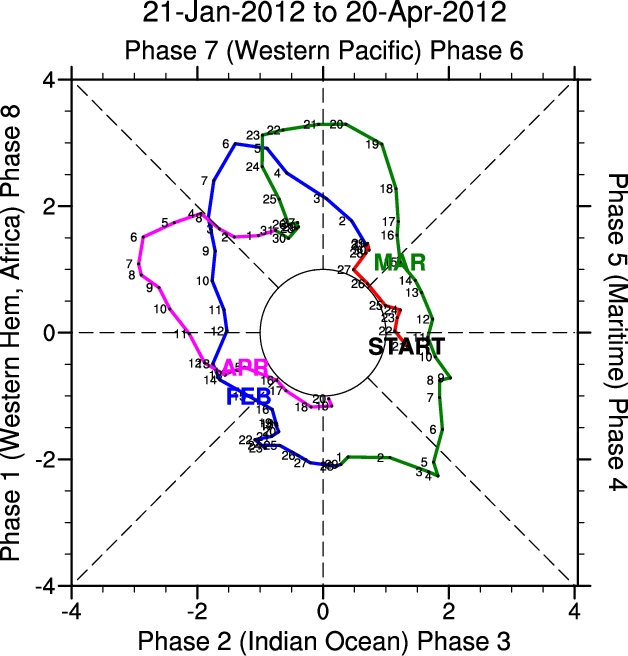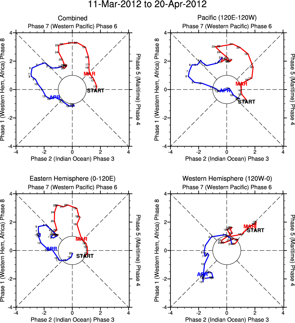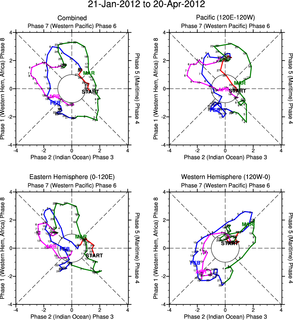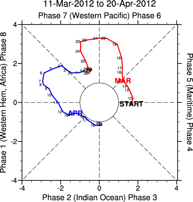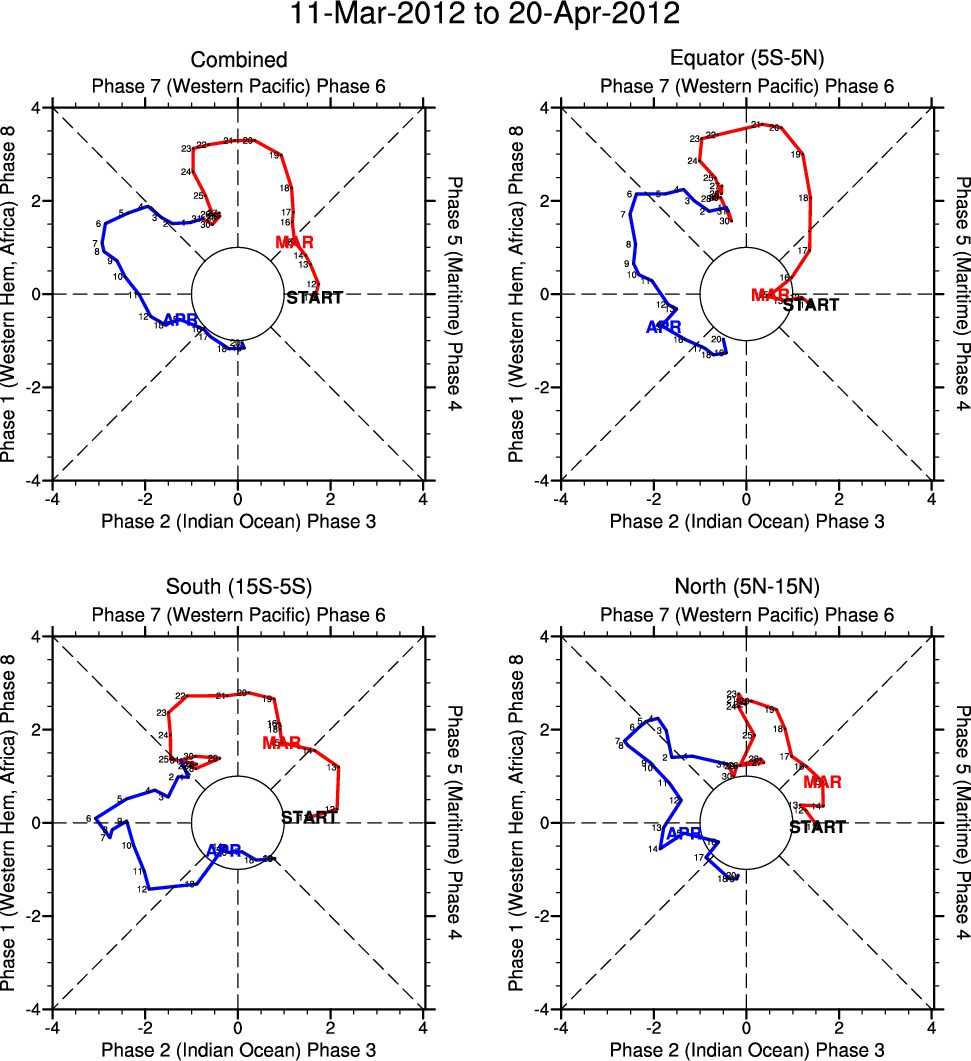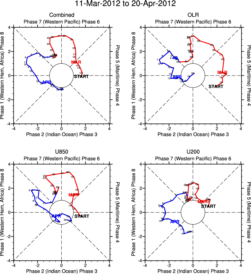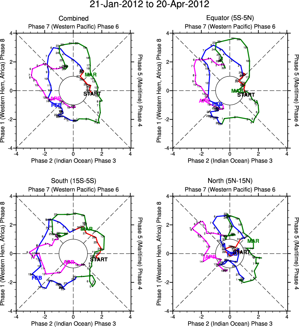 Wheeler and Hendon (2004) constructed the RMM index for monitoring the MJO. This index consists of the first two principal components (PCs) of OLR, 850-hPa zonal wind, and 200-hPa zonal wind averaged 15S-15N.