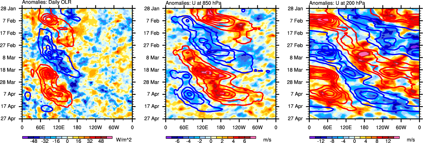 The Hovmollers show longitude-time plots for OLR, U-850, and U-200. The shading indicates the observed anomalies, while the contours are the projection of those anomalies onto the RMM EOFs.