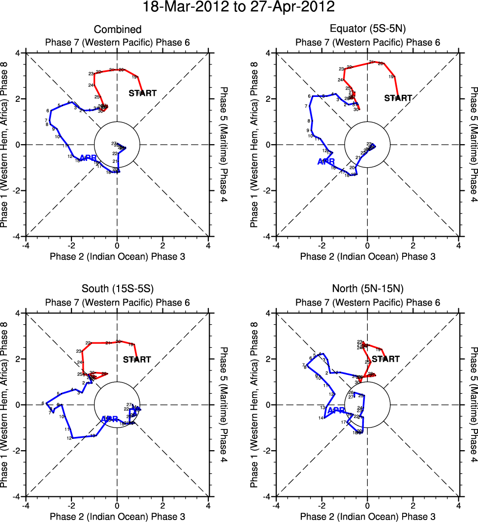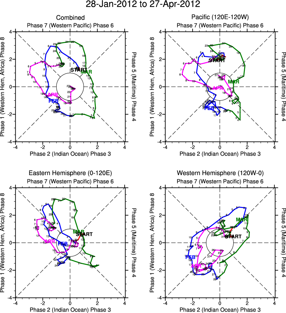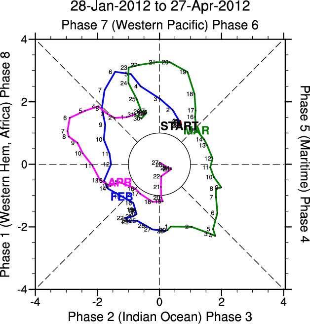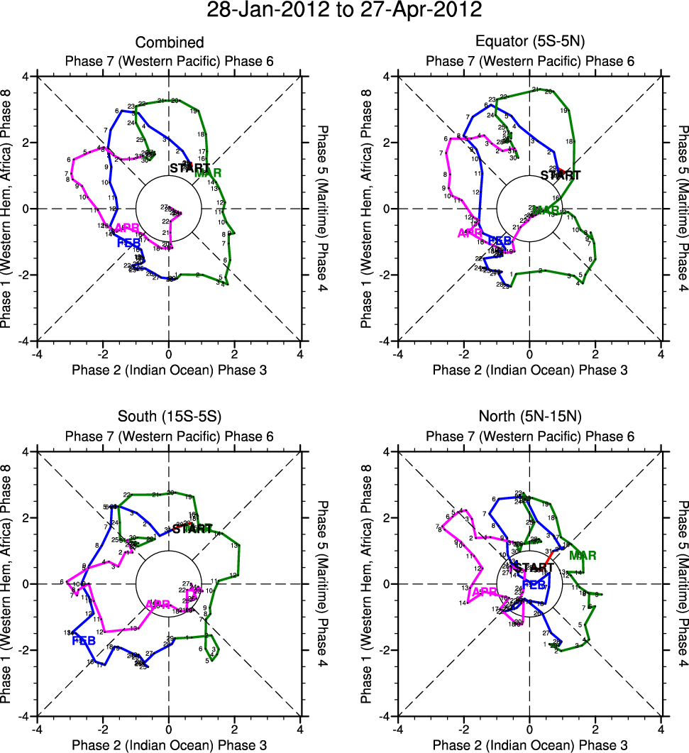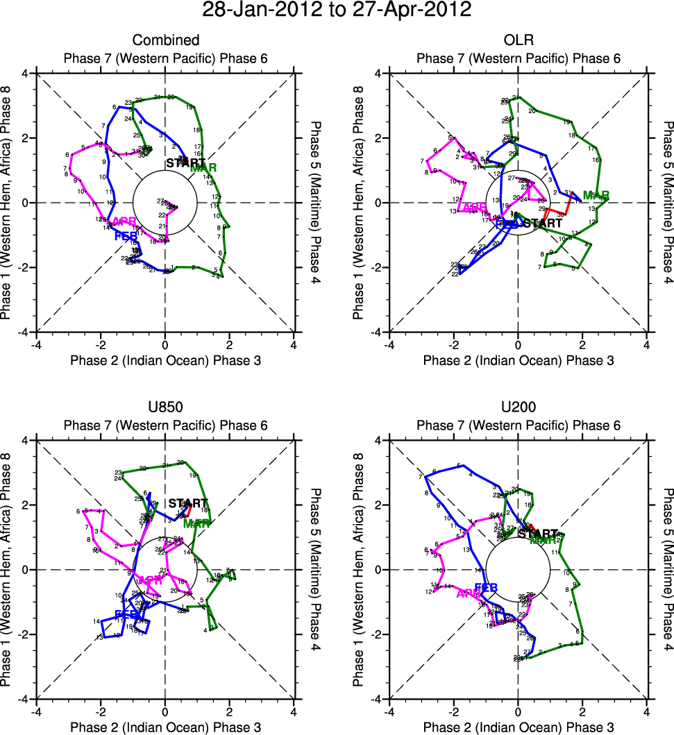 Wheeler and Hendon (2004) constructed the RMM index for monitoring the MJO. This index consists of the first two principal components (PCs) of OLR, 850-hPa zonal wind, and 200-hPa zonal wind averaged 15S-15N.
