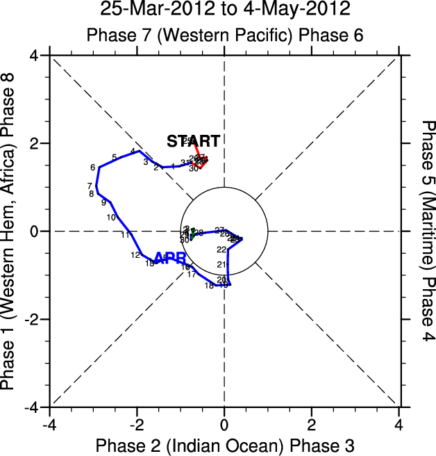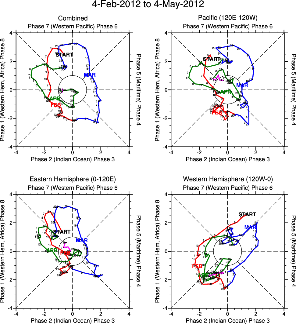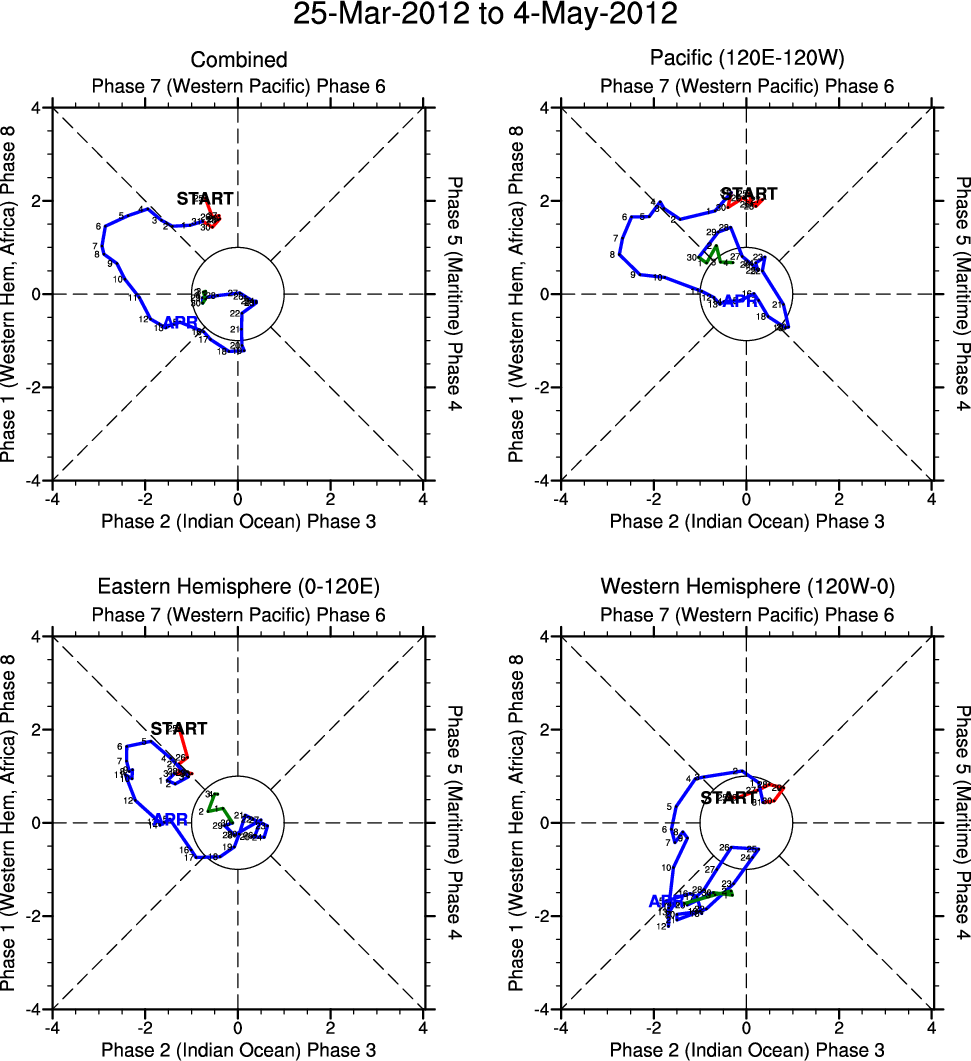 Wheeler and Hendon (2004) constructed the RMM index for monitoring the MJO. This index consists of the first two principal components (PCs) of OLR, 850-hPa zonal wind, and 200-hPa zonal wind averaged 15S-15N.
