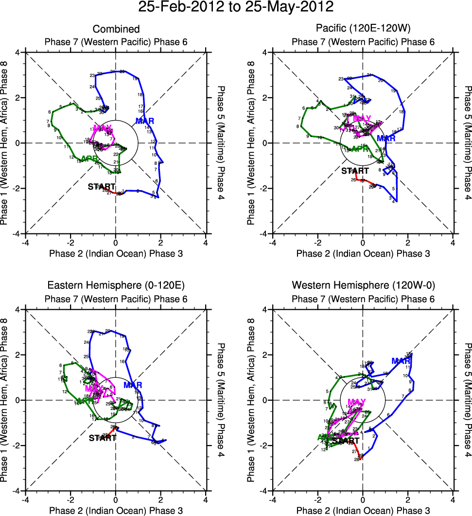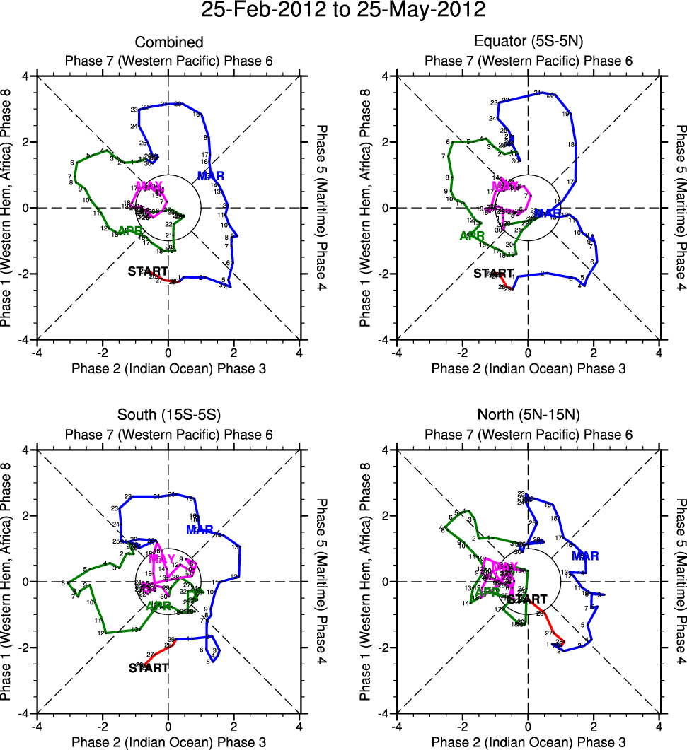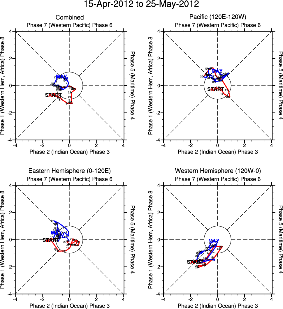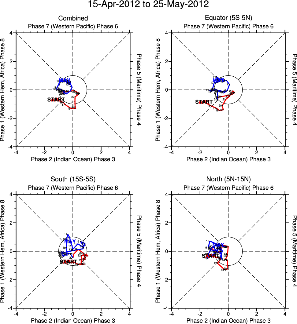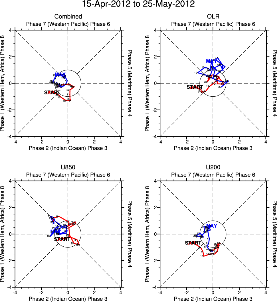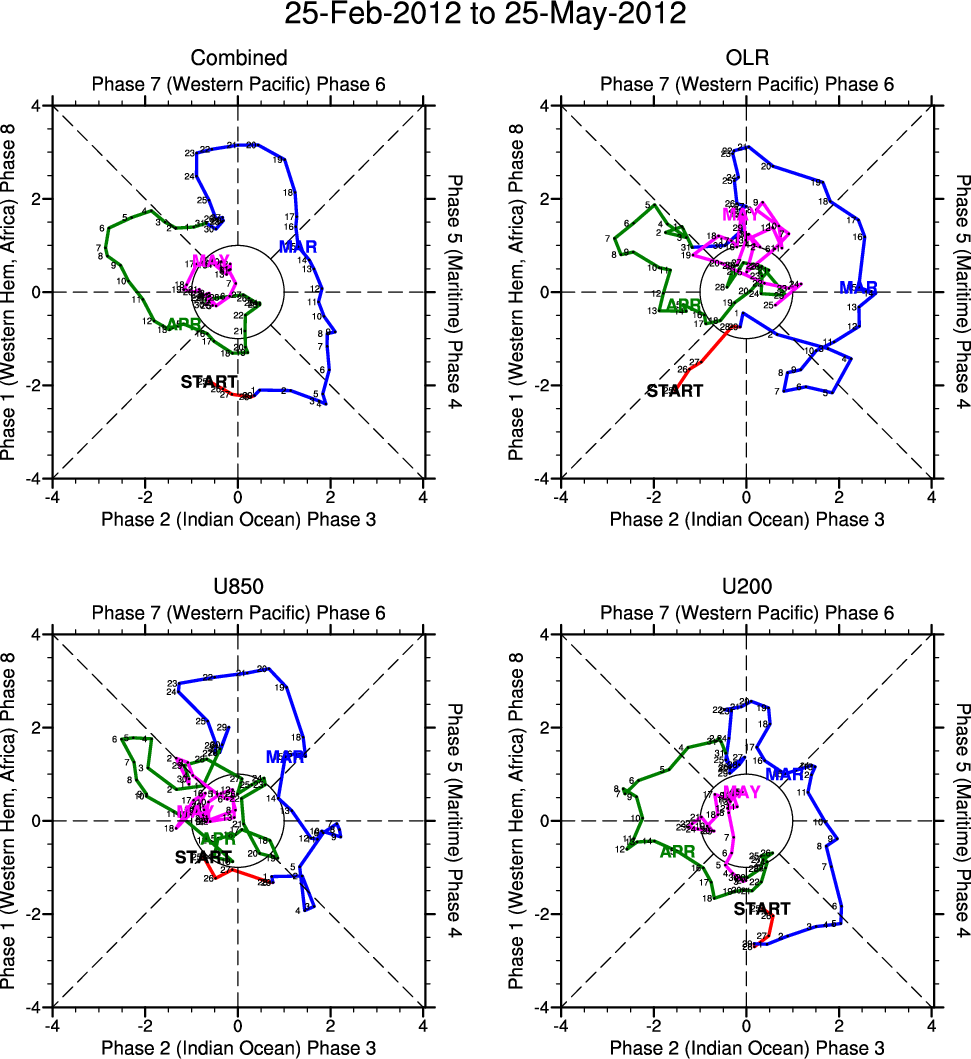 Wheeler and Hendon (2004) constructed the RMM index for monitoring the MJO. This index consists of the first two principal components (PCs) of OLR, 850-hPa zonal wind, and 200-hPa zonal wind averaged 15S-15N.