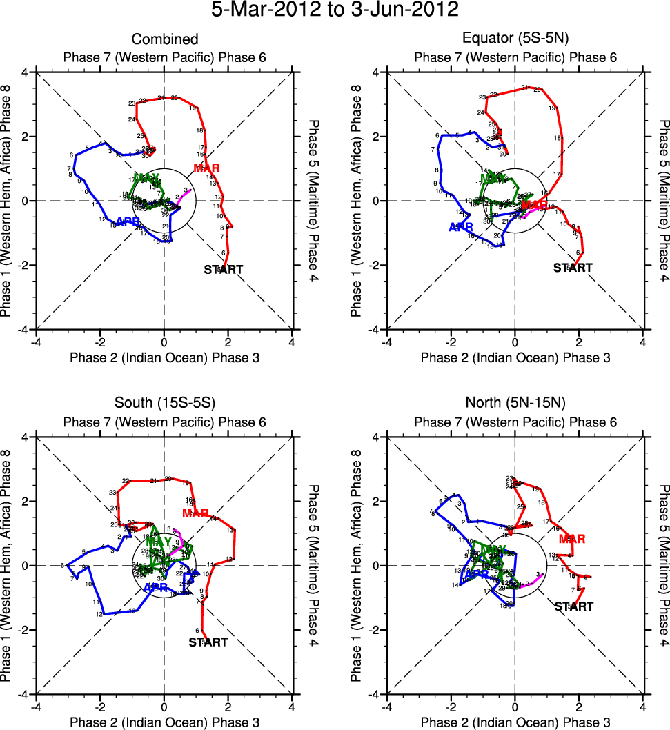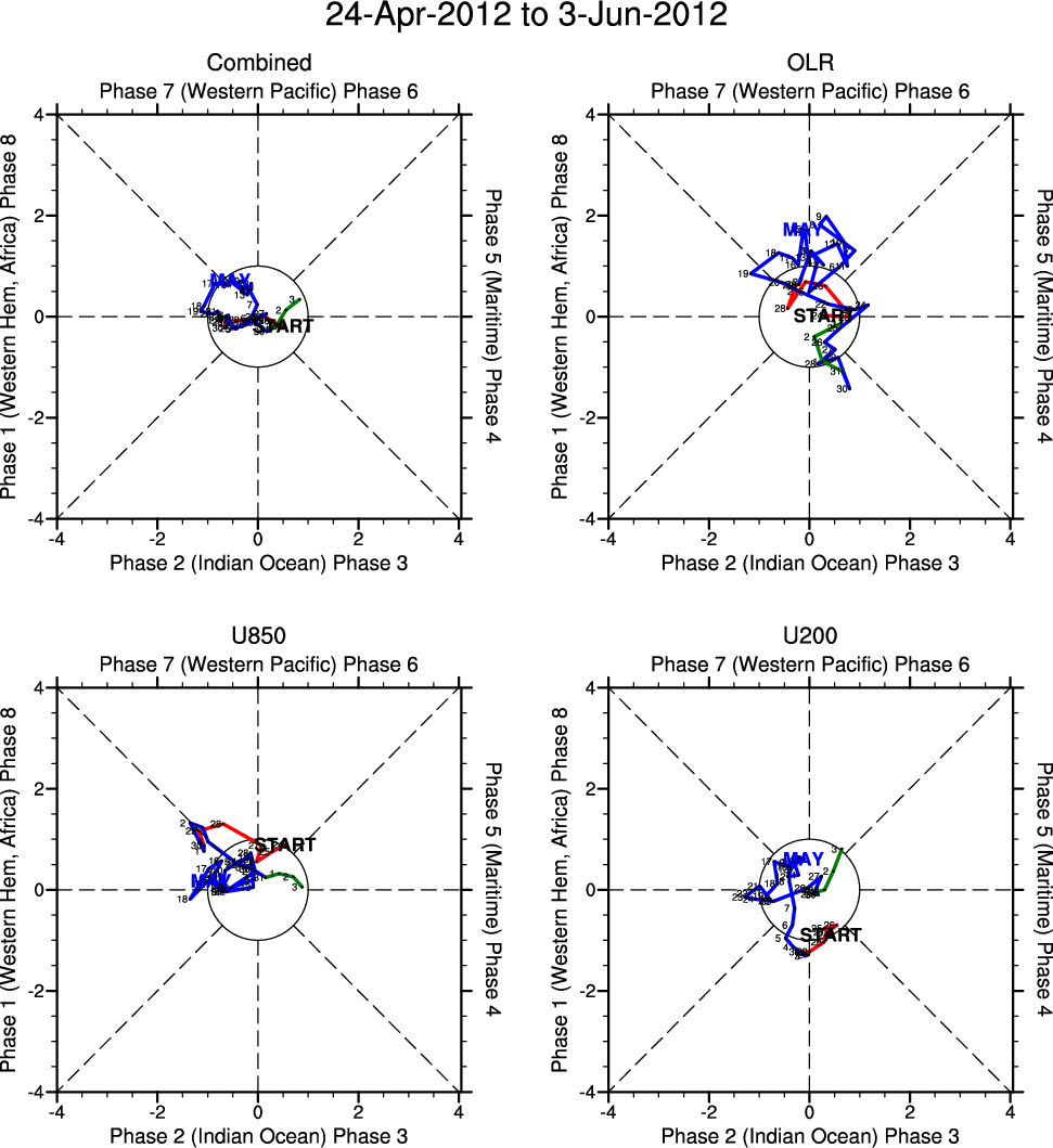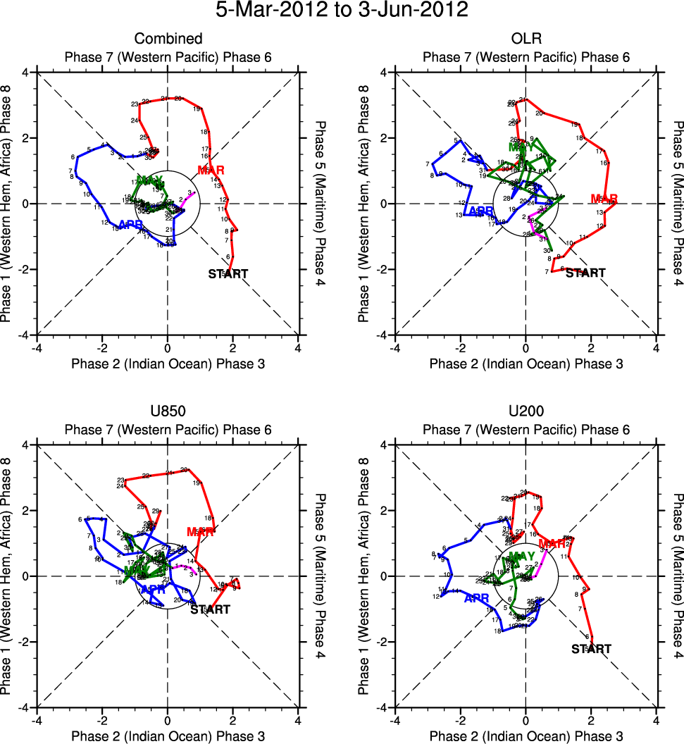 Wheeler and Hendon (2004) constructed the RMM index for monitoring the MJO. This index consists of the first two principal components (PCs) of OLR, 850-hPa zonal wind, and 200-hPa zonal wind averaged 15S-15N.