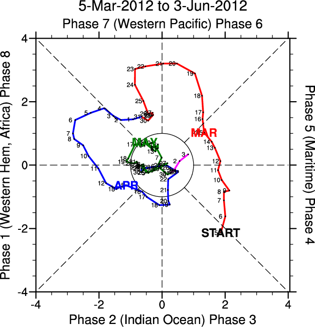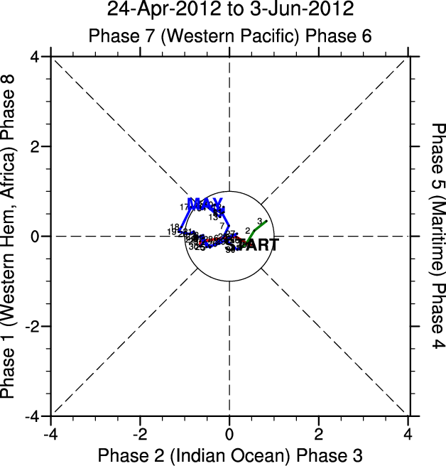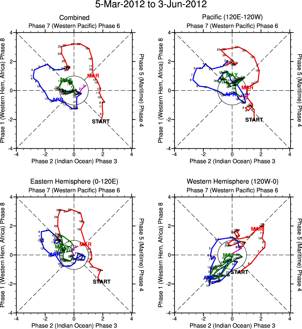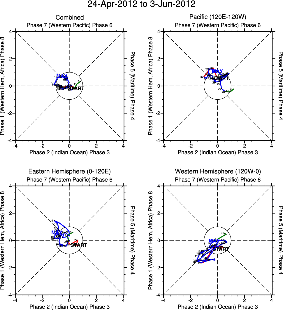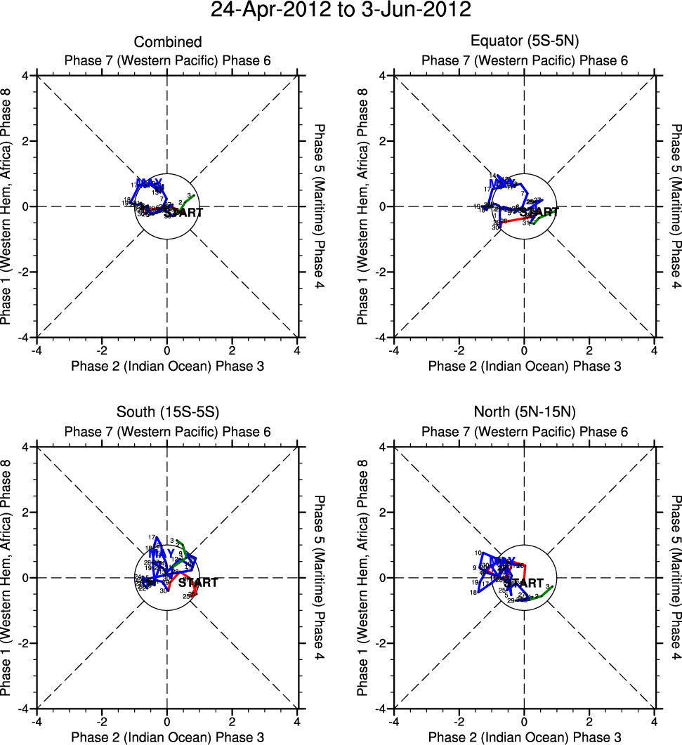 Wheeler and Hendon (2004) constructed the RMM index for monitoring the MJO. This index consists of the first two principal components (PCs) of OLR, 850-hPa zonal wind, and 200-hPa zonal wind averaged 15S-15N.