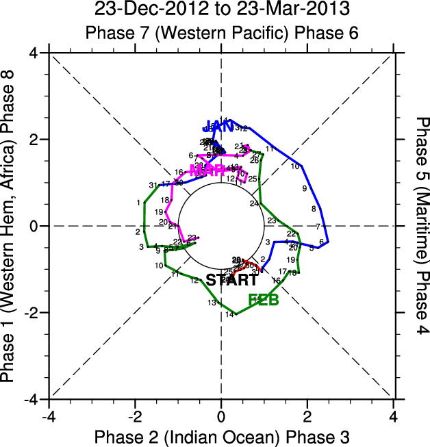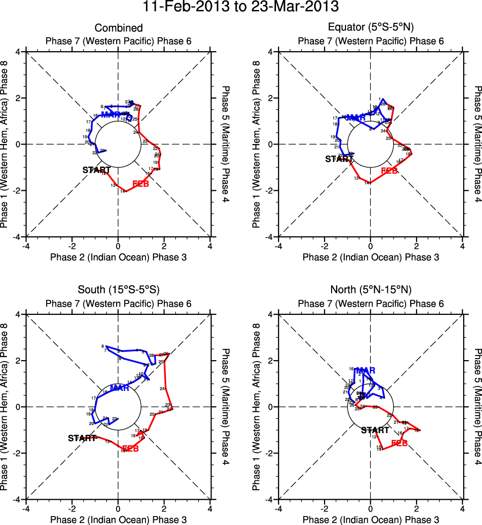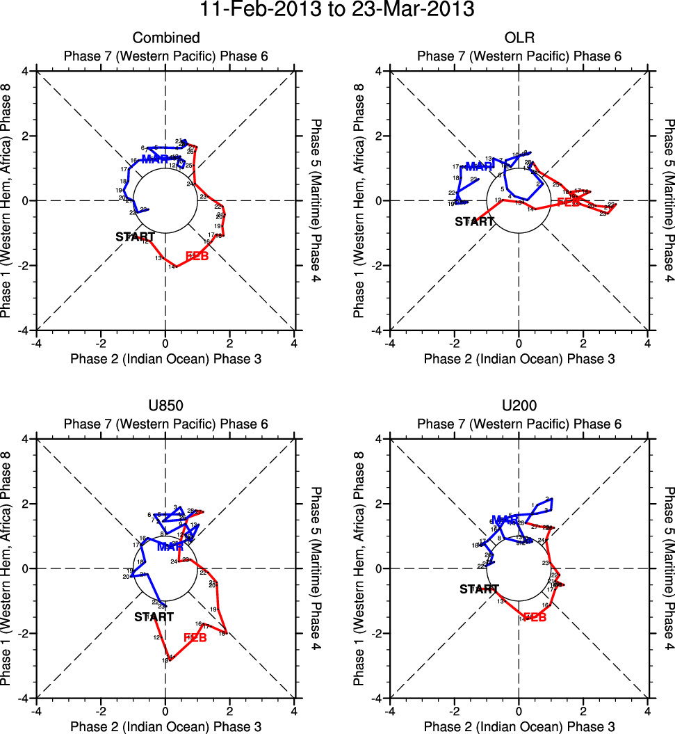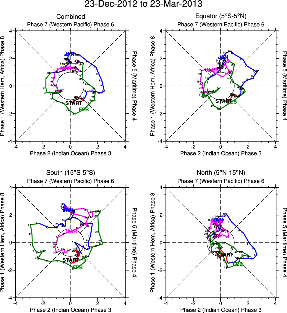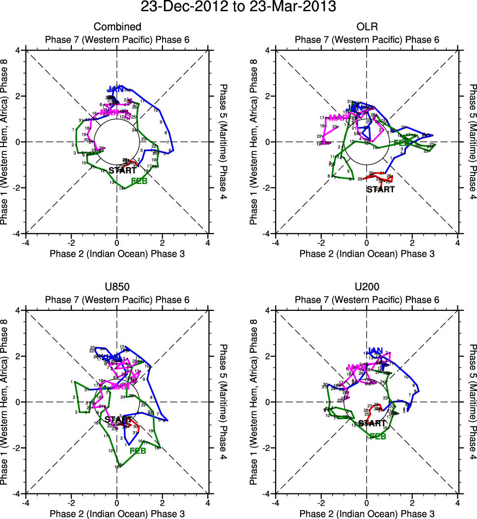 Wheeler and Hendon (2004) constructed the RMM index for monitoring the MJO. This index consists of the first two principal components (PCs) of OLR, 850-hPa zonal wind, and 200-hPa zonal wind averaged 15S-15N.