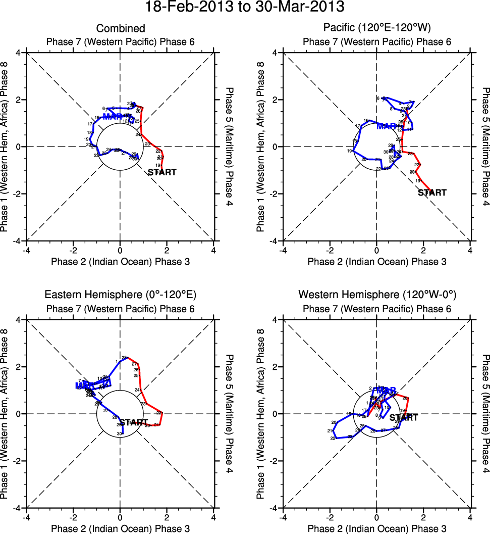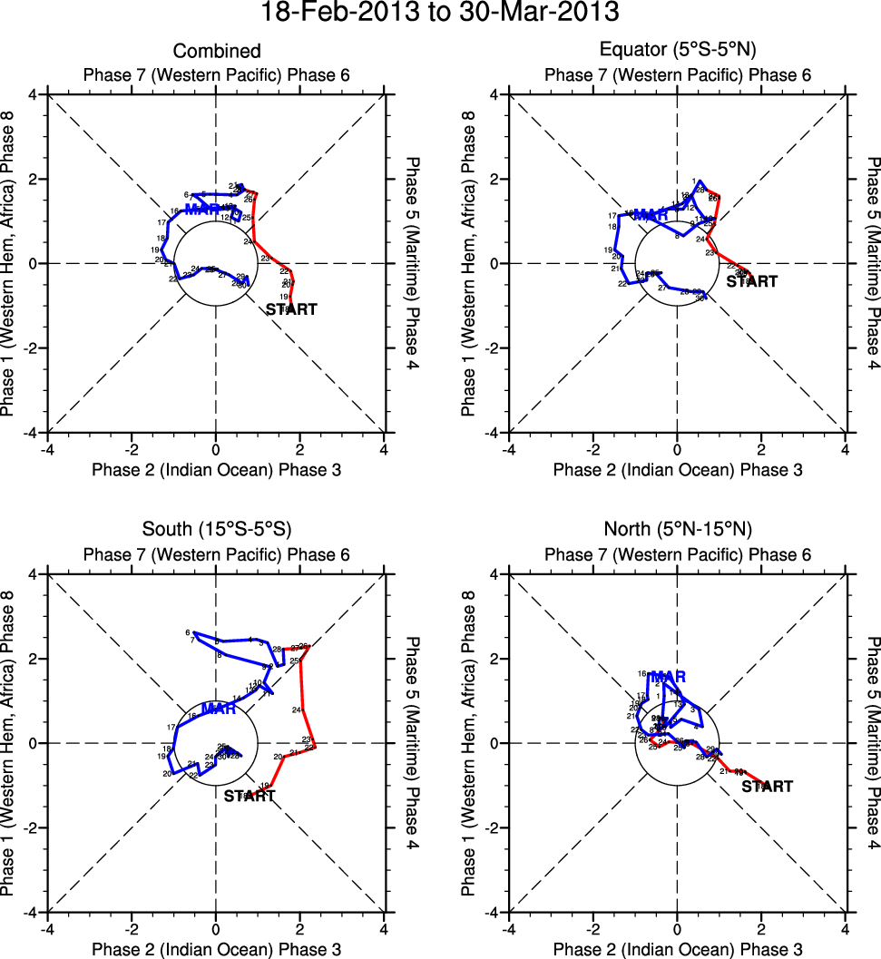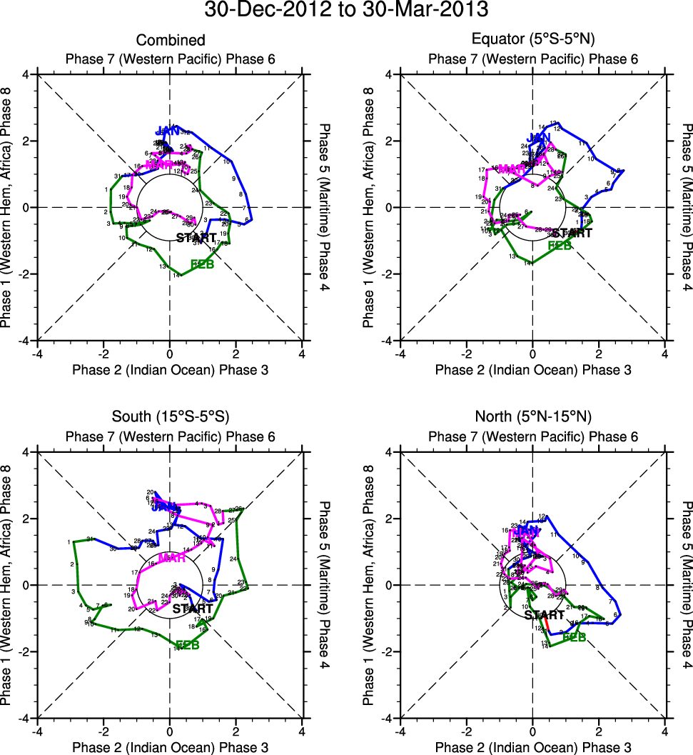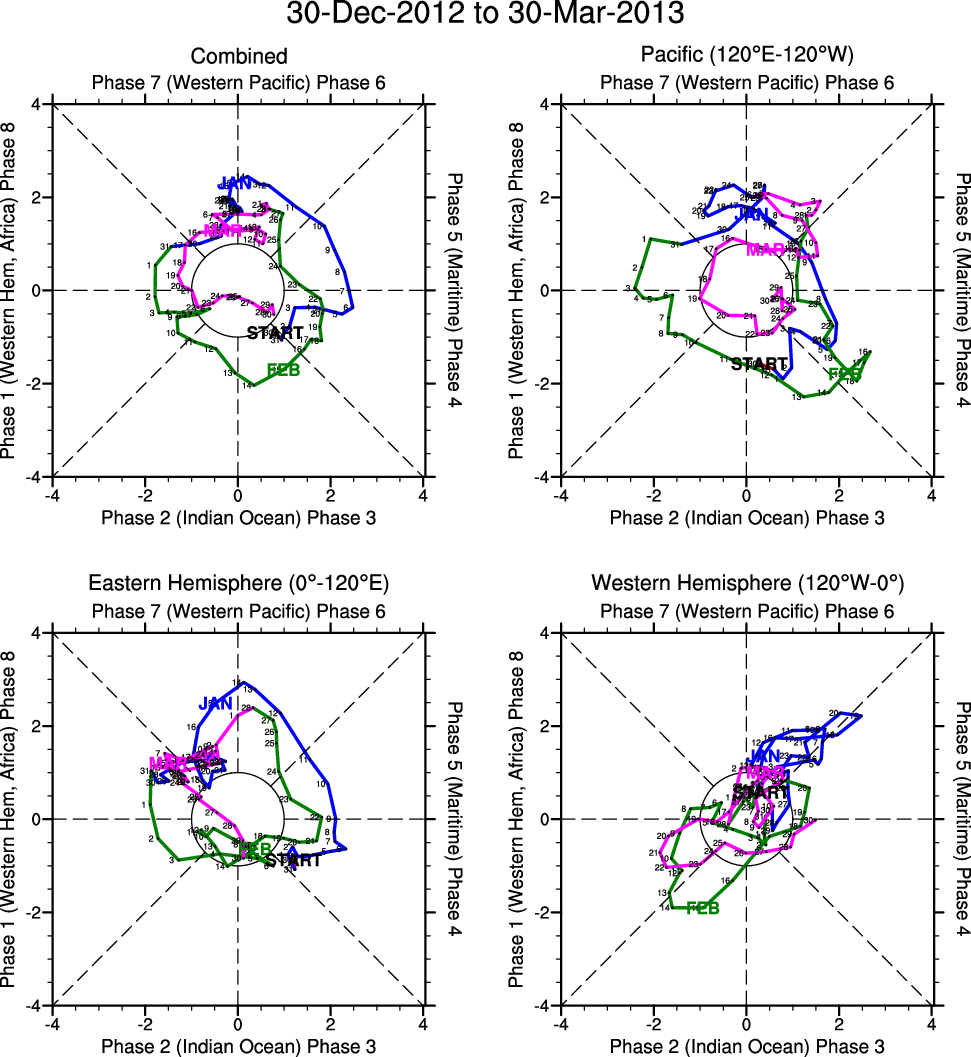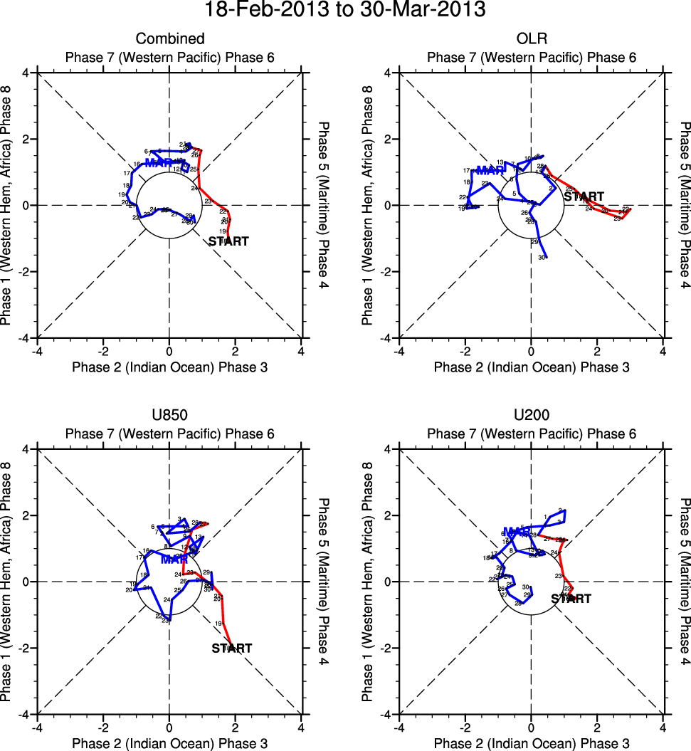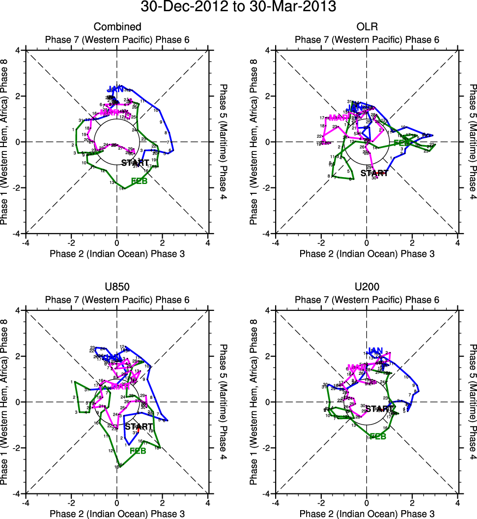 Wheeler and Hendon (2004) constructed the RMM index for monitoring the MJO. This index consists of the first two principal components (PCs) of OLR, 850-hPa zonal wind, and 200-hPa zonal wind averaged 15S-15N.