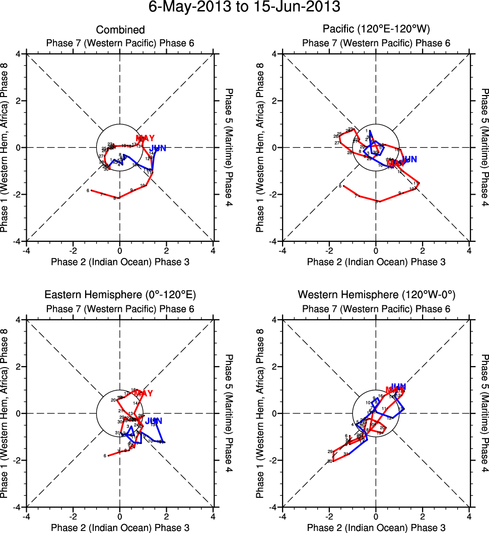 Wheeler and Hendon (2004) constructed the RMM index for monitoring the MJO. This index consists of the first two principal components (PCs) of OLR, 850-hPa zonal wind, and 200-hPa zonal wind averaged 15S-15N.