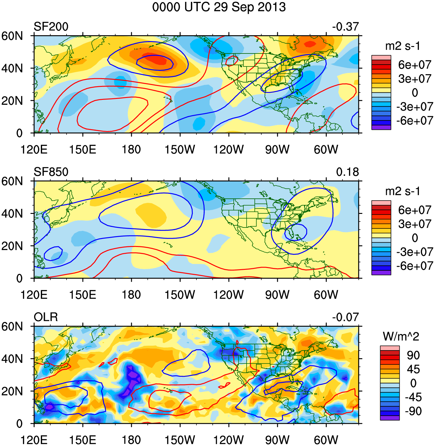 Maps of recent OLR anomalies (shaded), 200-hPa streamfunction