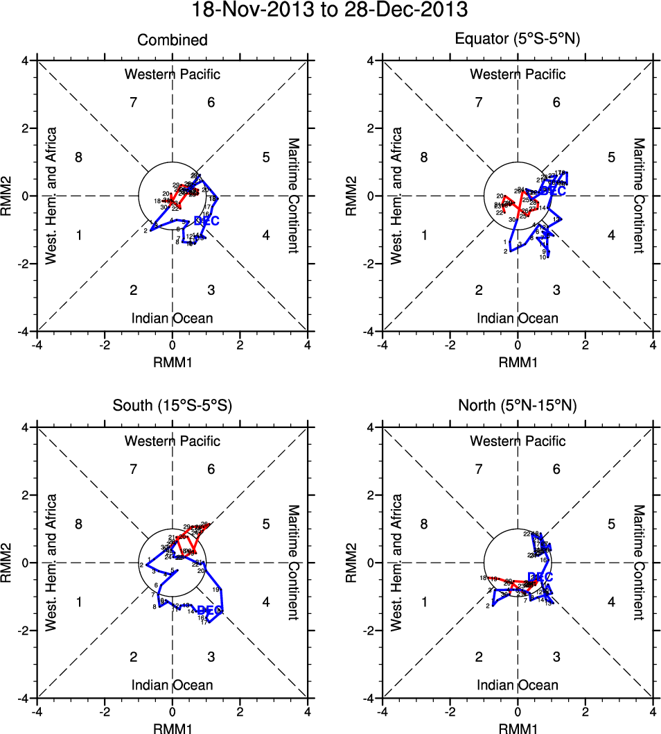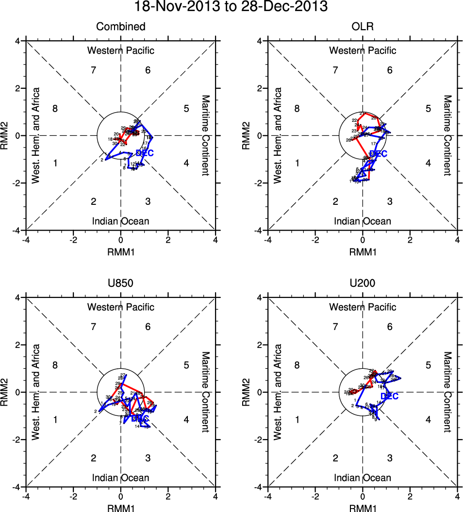 Wheeler and Hendon (2004) constructed the RMM index for monitoring the MJO. This index consists of the first two principal components (PCs) of OLR, 850-hPa zonal wind, and 200-hPa zonal wind averaged 15S-15N.