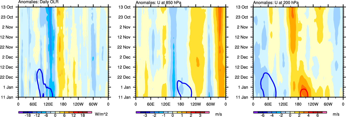 The Hovmollers show longitude-time plots for OLR, U-850, and U-200. The shading indicates the observed anomalies, while the contours are the projection of those anomalies onto the RMM EOFs.