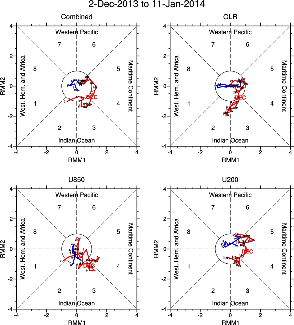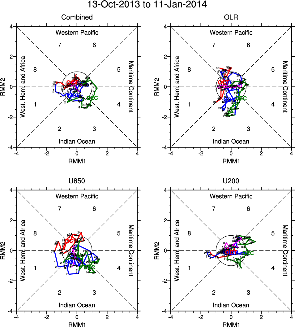 Wheeler and Hendon (2004) constructed the RMM index for monitoring the MJO. This index consists of the first two principal components (PCs) of OLR, 850-hPa zonal wind, and 200-hPa zonal wind averaged 15S-15N.