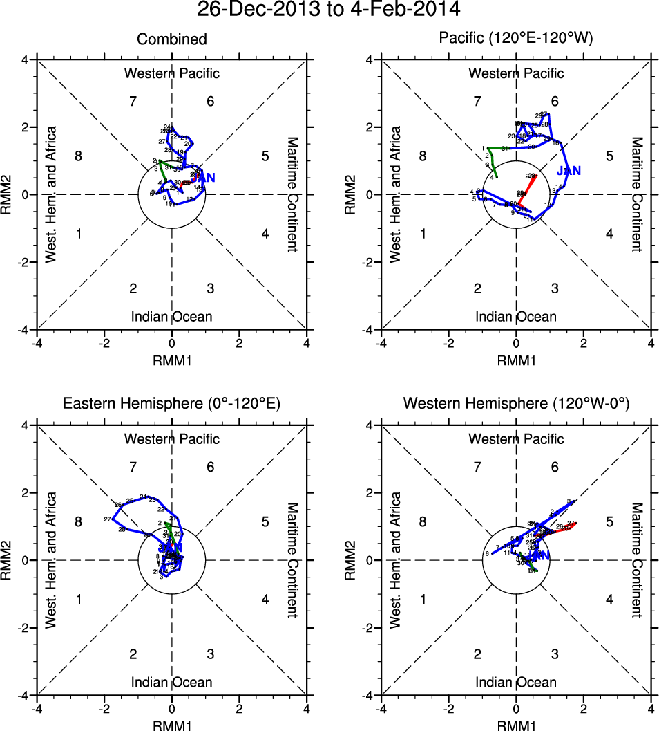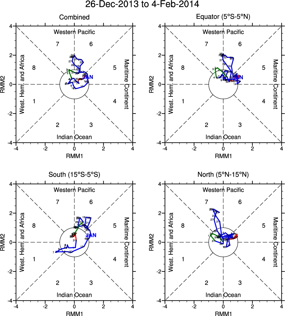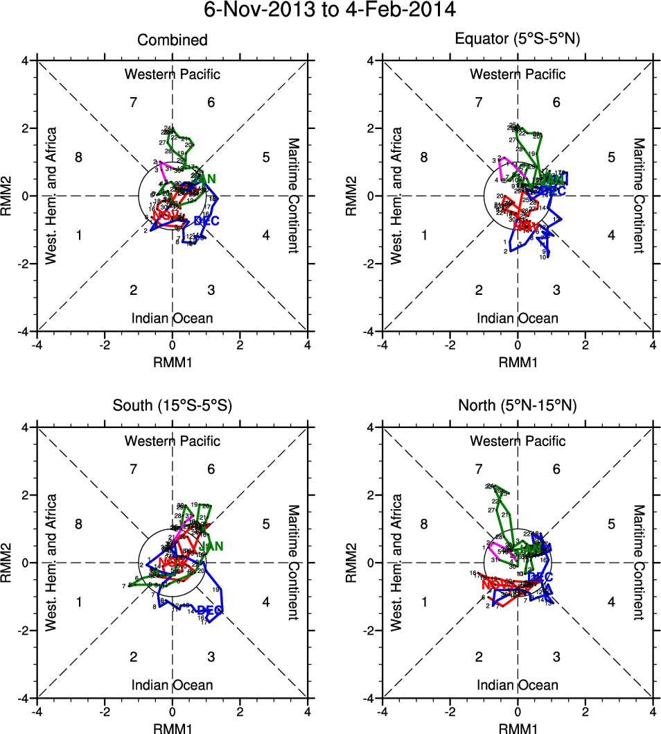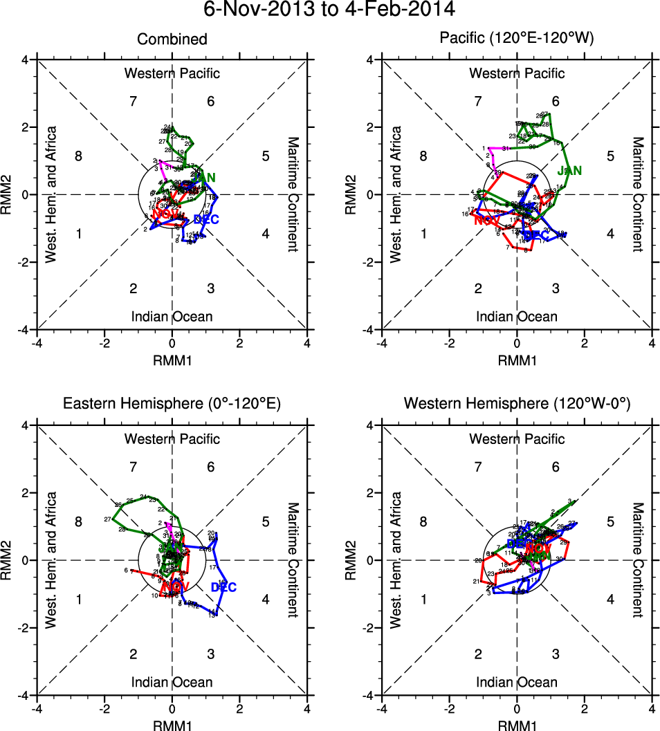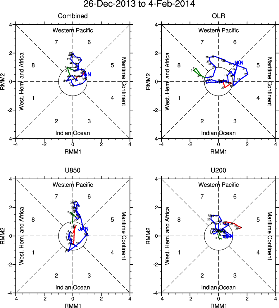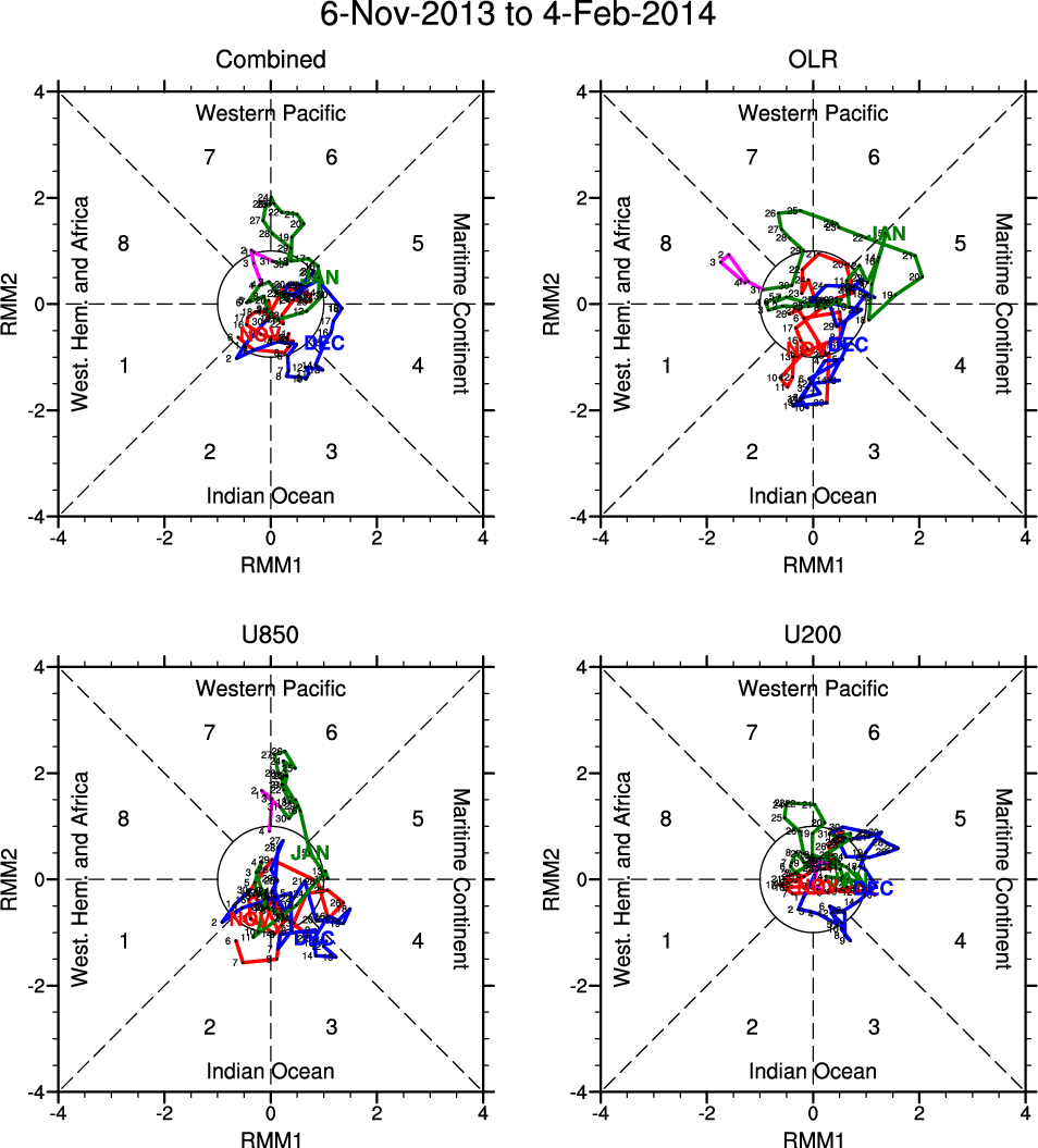 Wheeler and Hendon (2004) constructed the RMM index for monitoring the MJO. This index consists of the first two principal components (PCs) of OLR, 850-hPa zonal wind, and 200-hPa zonal wind averaged 15S-15N.