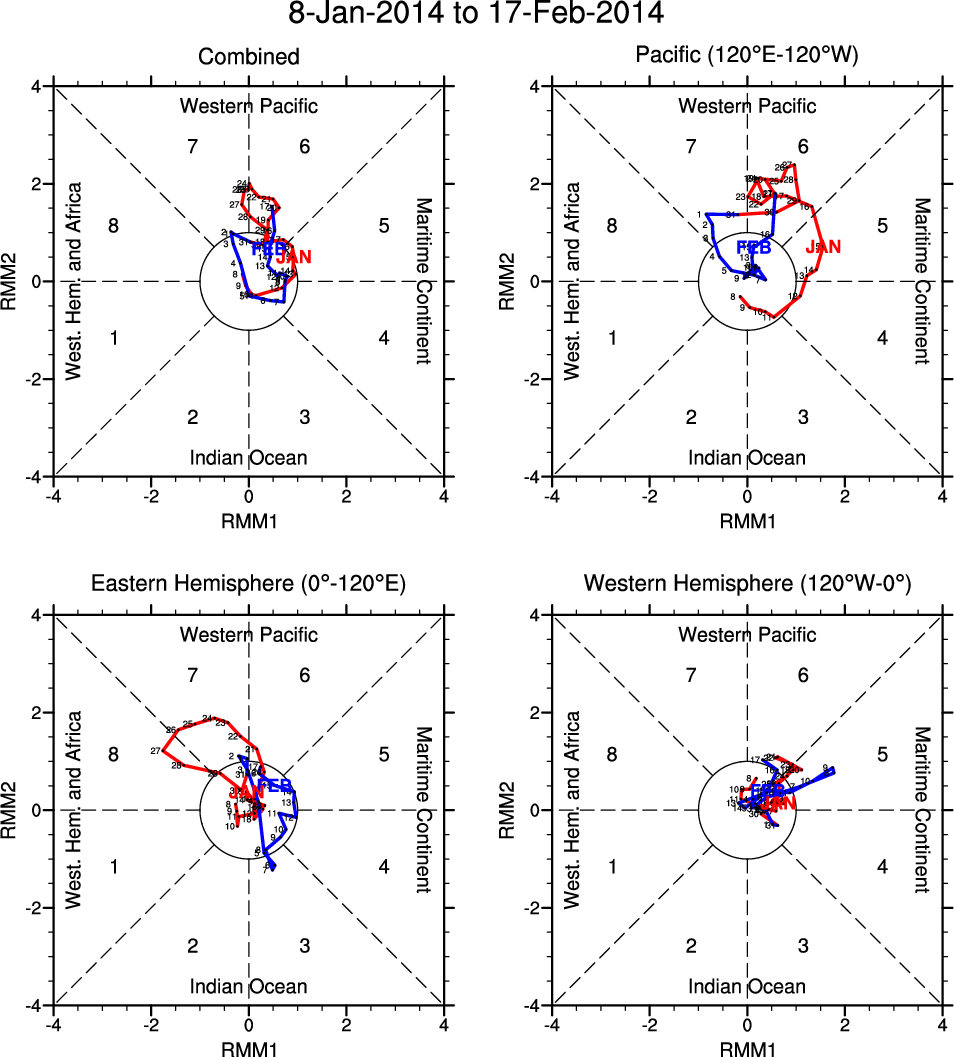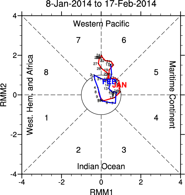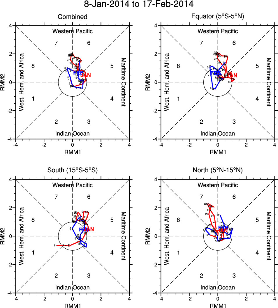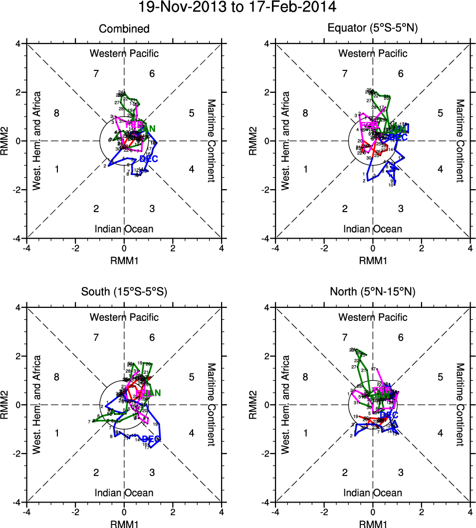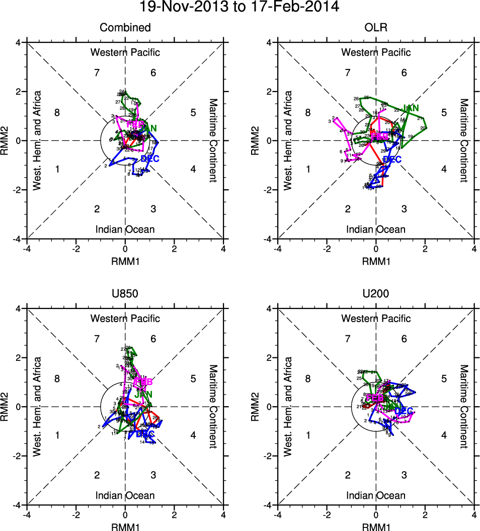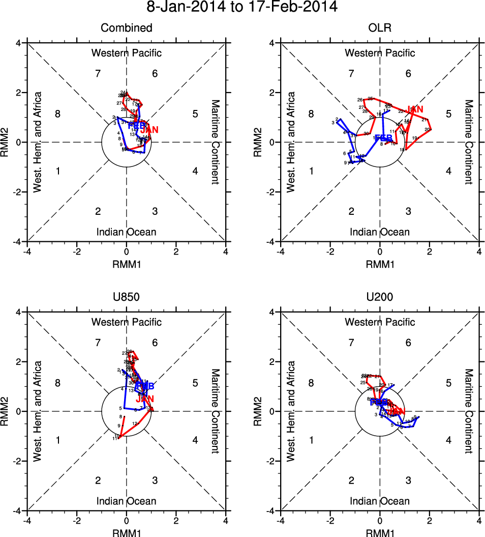 Wheeler and Hendon (2004) constructed the RMM index for monitoring the MJO. This index consists of the first two principal components (PCs) of OLR, 850-hPa zonal wind, and 200-hPa zonal wind averaged 15S-15N.