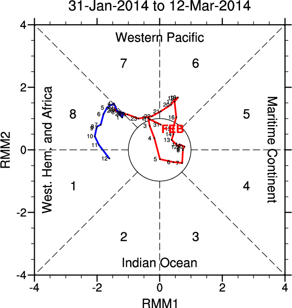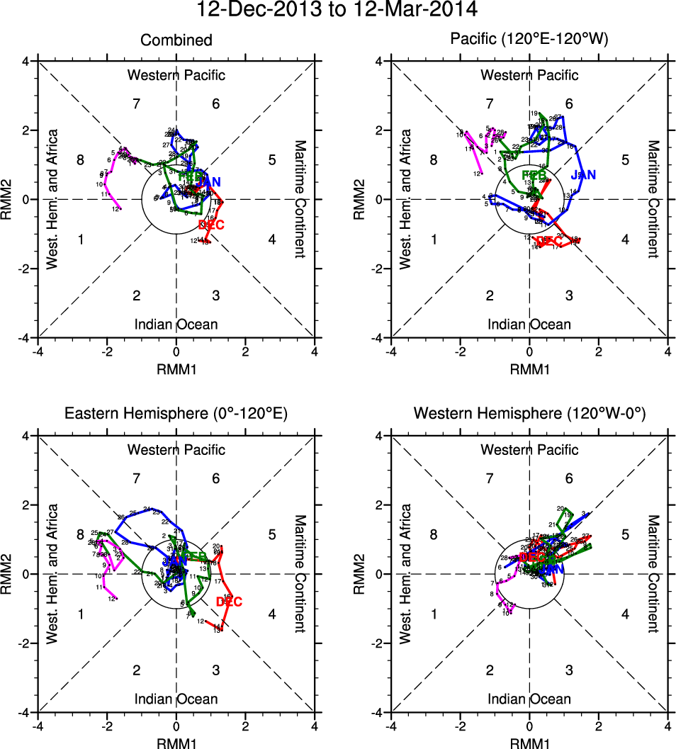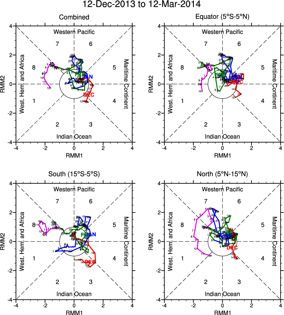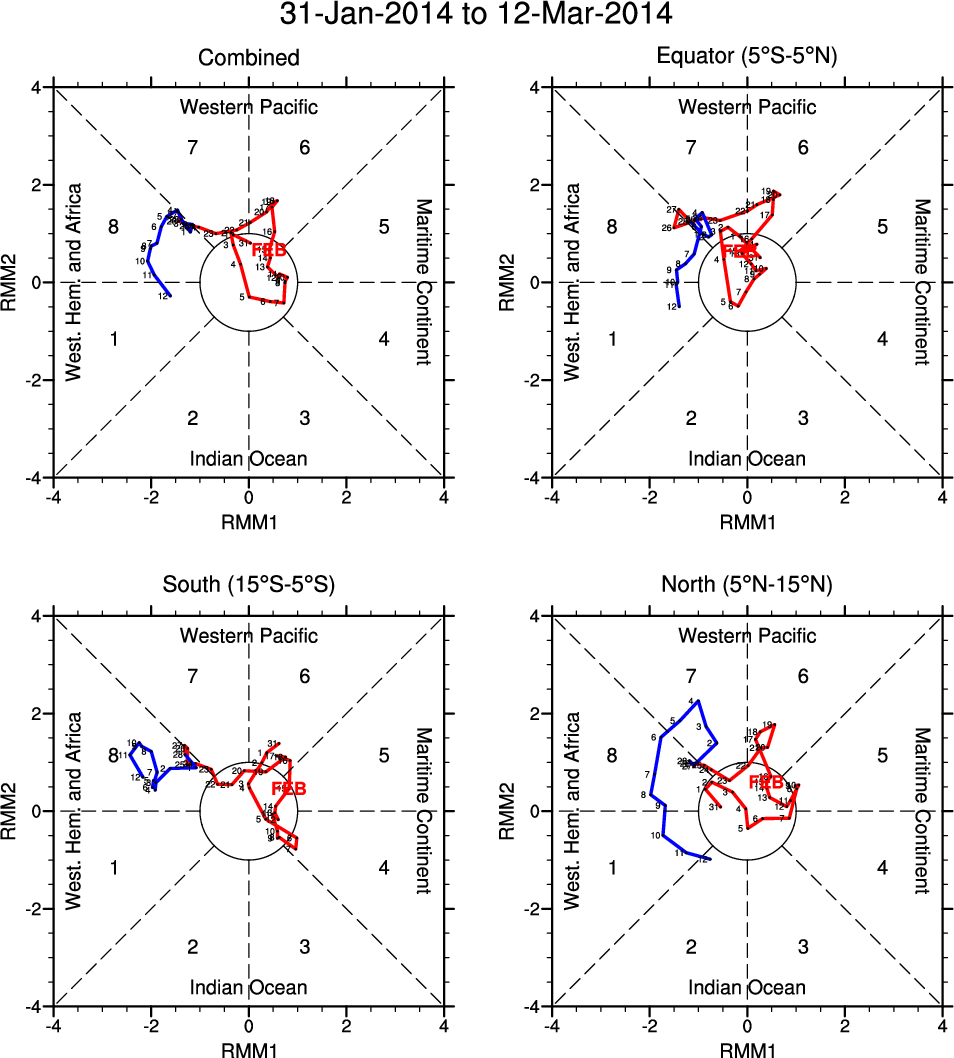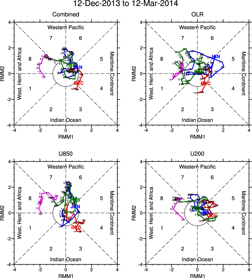 Wheeler and Hendon (2004) constructed the RMM index for monitoring the MJO. This index consists of the first two principal components (PCs) of OLR, 850-hPa zonal wind, and 200-hPa zonal wind averaged 15S-15N.