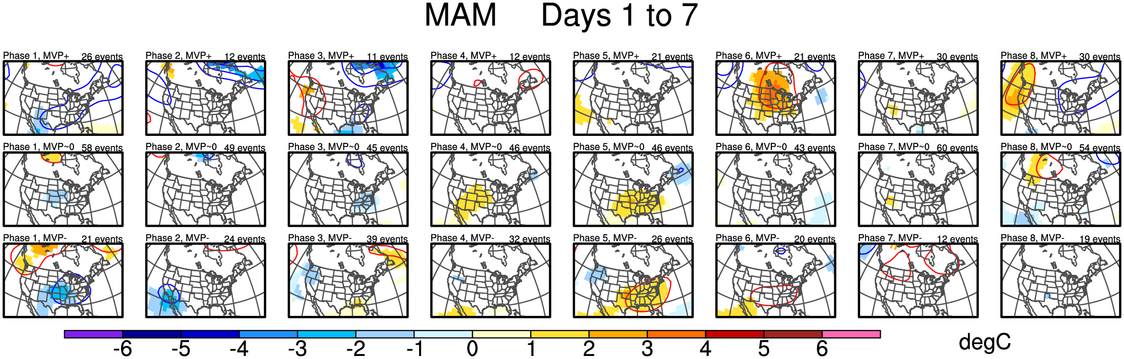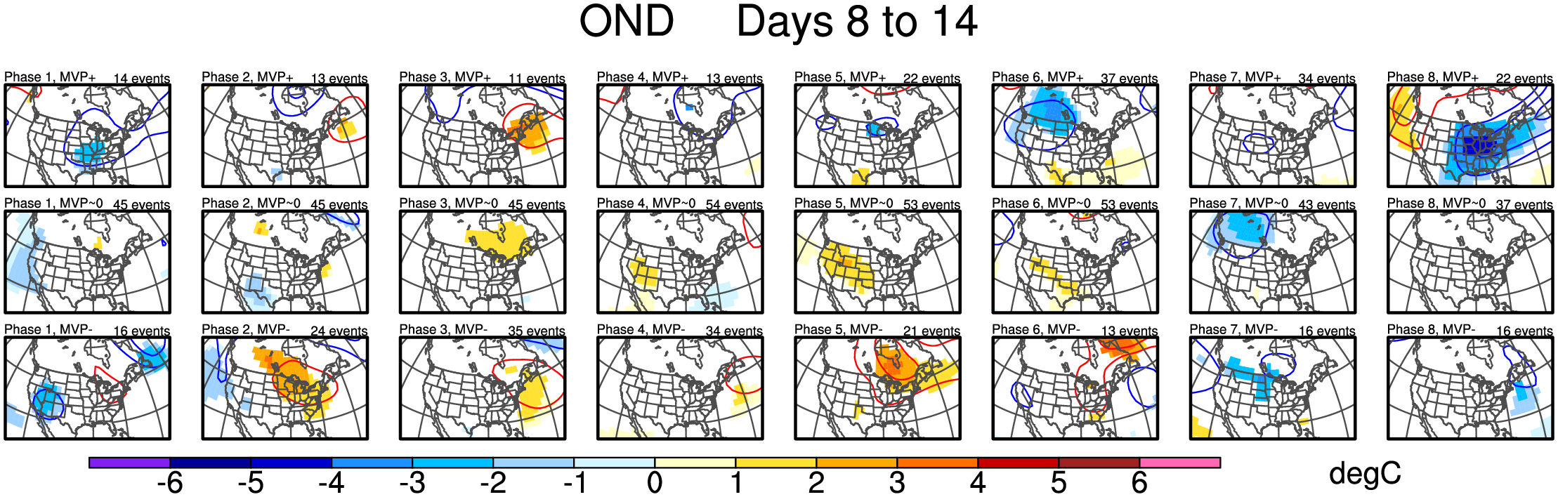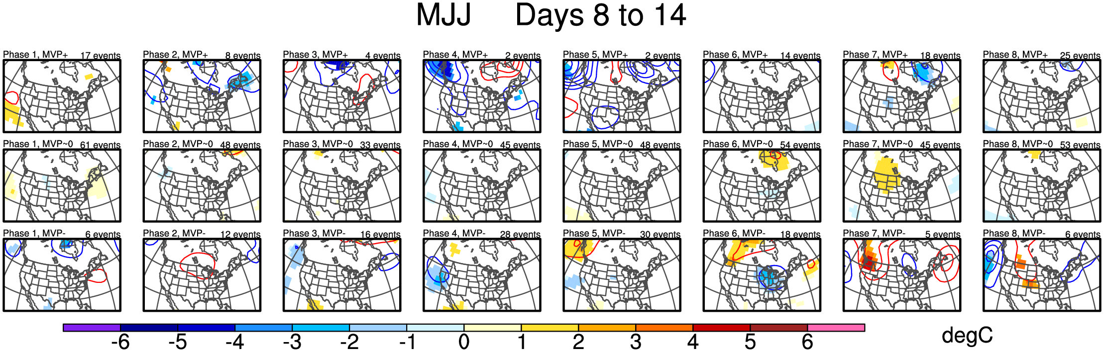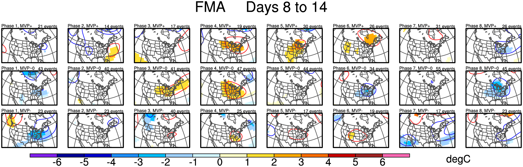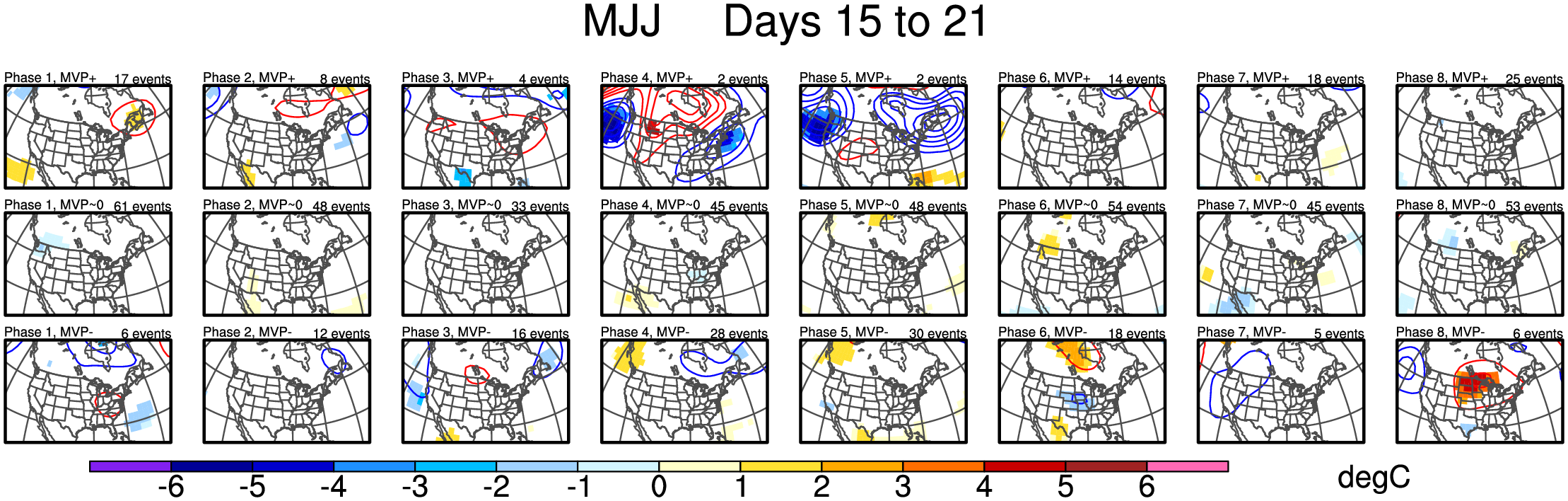 Maps of 500-hPa geopotential height anomalies (contoured every 30 m) and significant 850-hPa temperature anomalies, as shown in Schreck et al. (2013).