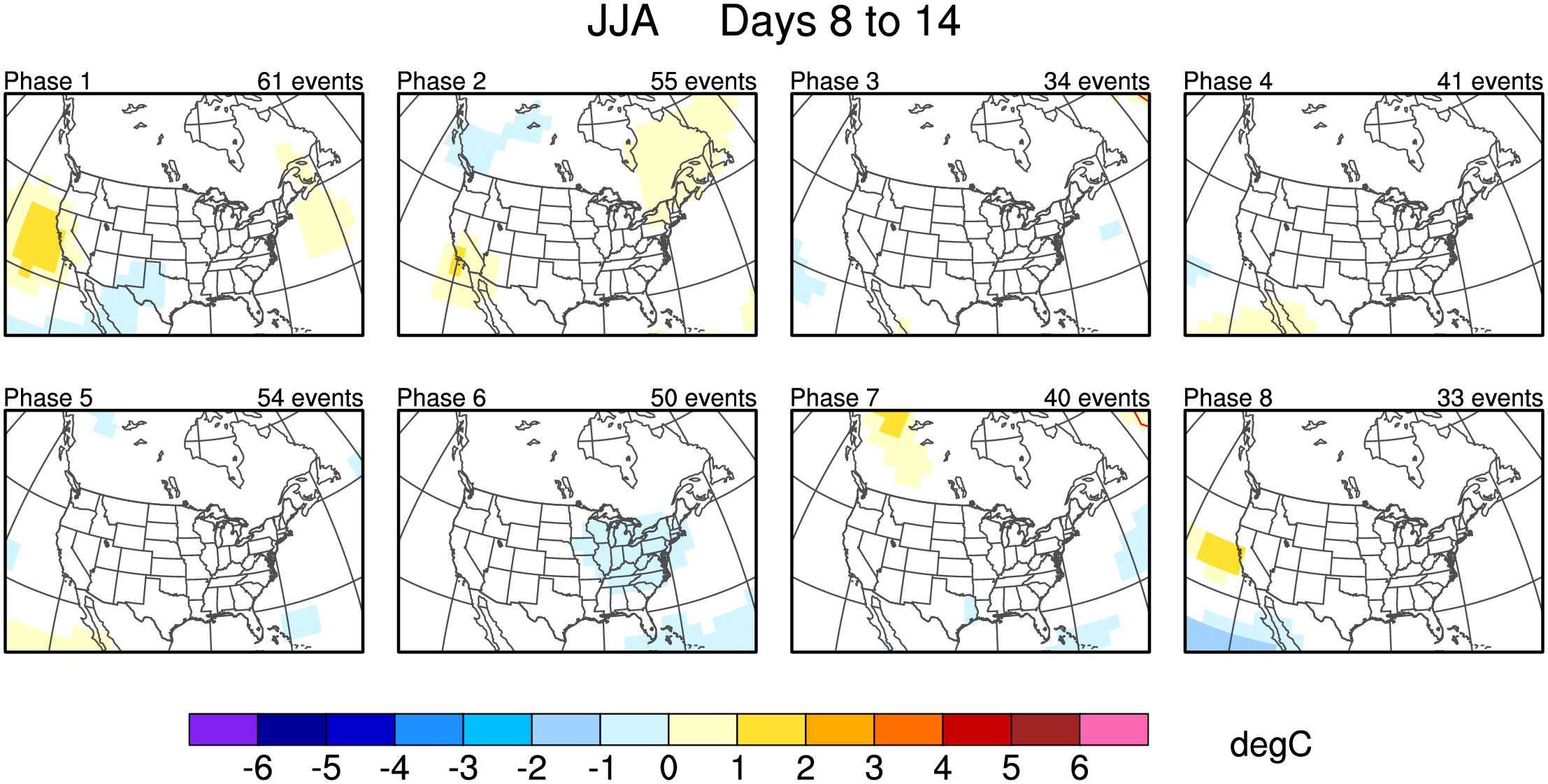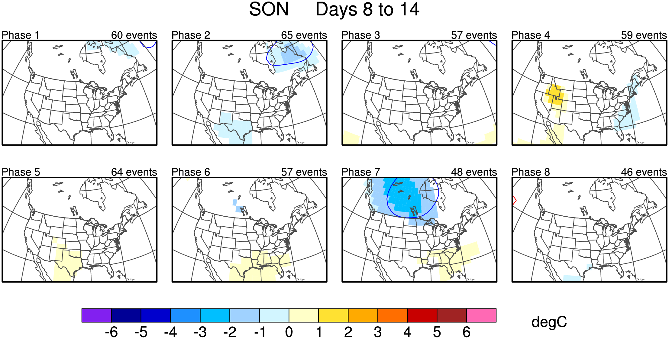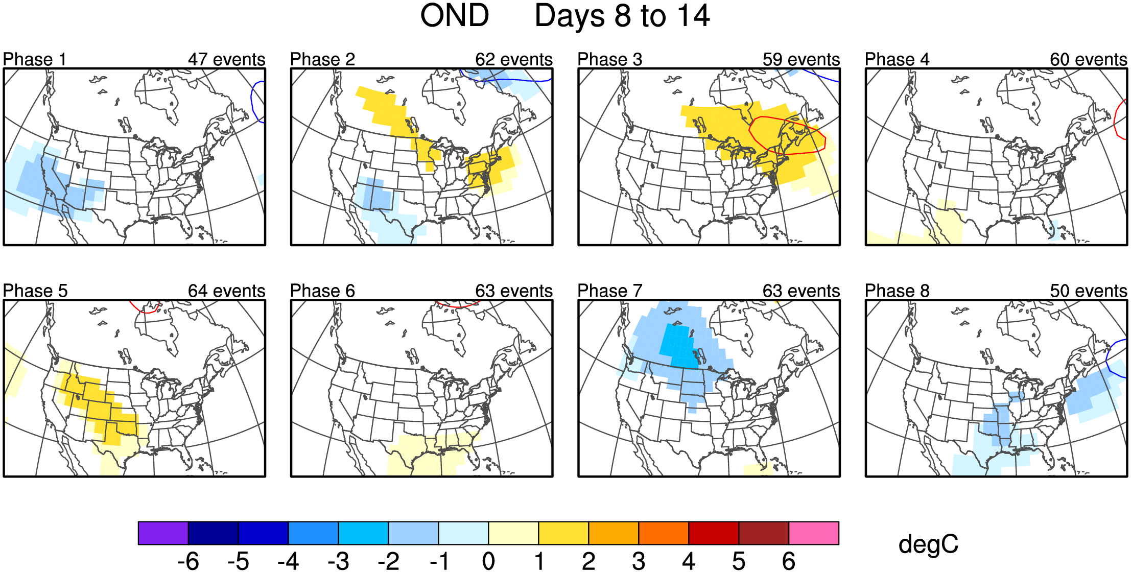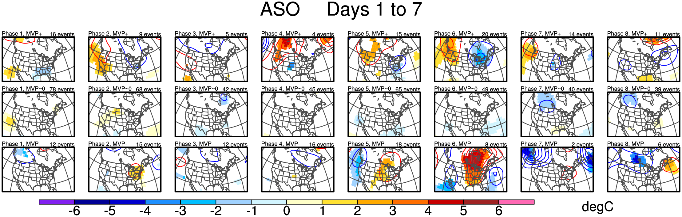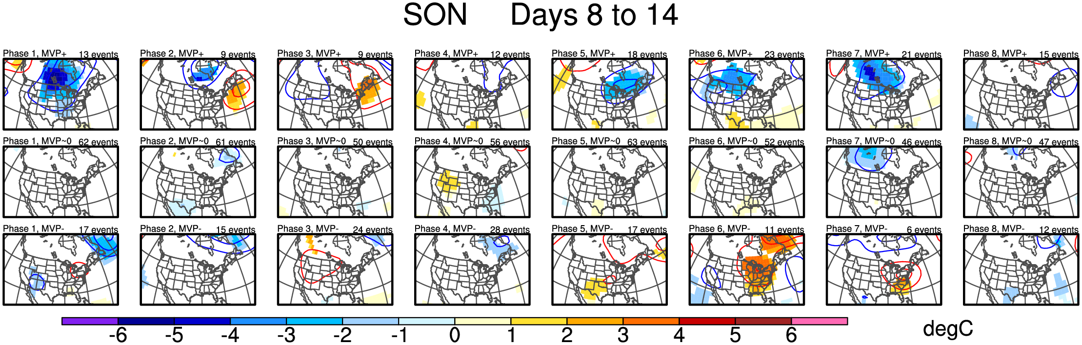 Maps of 500-hPa geopotential height anomalies (contoured every 30 m) and significant 850-hPa temperature anomalies, as shown in Schreck et al. (2013).